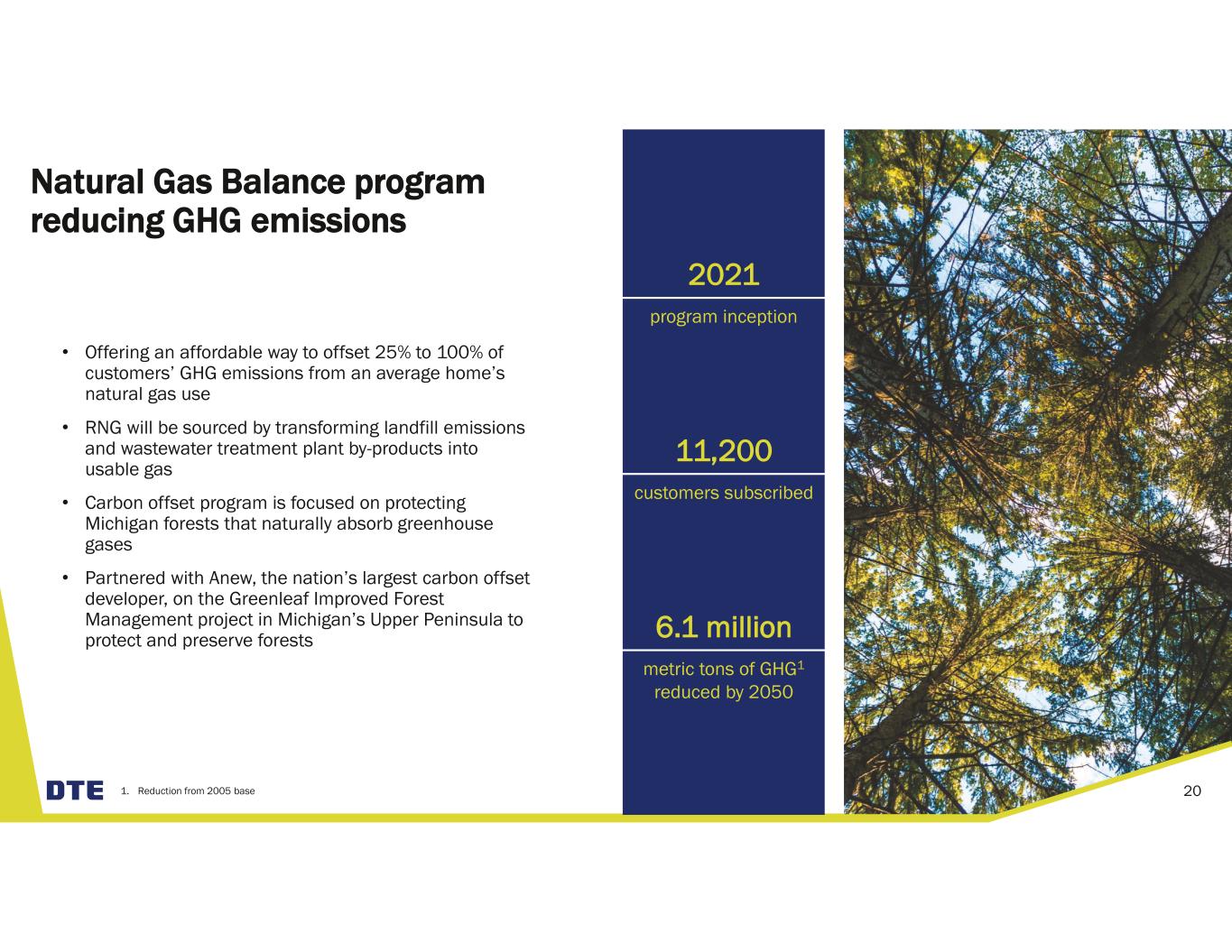 Natural Gas Balance program reducing GHG emissions 1. Reduction from 2005 base • Offering an affordable way to offset 25% to 100% of customers’ GHG emissions from an average home’s natural gas use • RNG will be sourced by transforming landfill emissions and wastewater treatment plant by-products into usable gas • Carbon offset program is focused on protecting Michigan forests that naturally absorb greenhouse gases • Partnered with Anew, the nation’s largest carbon offset developer, on the Greenleaf Improved Forest Management project in Michigan’s Upper Peninsula to protect and preserve forests 2021 program inception 11,200 customers subscribed 6.1 million metric tons of GHG1 reduced by 2050 20