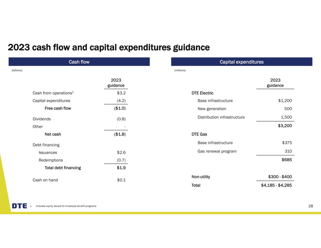 2023 cash flow and capital expenditures guidance 1. Includes equity issued for employee benefit programs 28 (millions) Cash flow Capital expenditures (billions) 2023 guidance DTE Electric Base infrastructure $1,200 New generation 500 Distribution infrastructure 1,500 $3,200 DTE Gas Base infrastructure $375 Gas renewal program 310 $685 Non-utility $300 - $400 Total $4,185 - $4,285 2023 guidance Cash from operations1 $3.2 Capital expenditures (4.2) Free cash flow ($1.0) Dividends (0.8) Other - Net cash ($1.8) Debt financing Issuances $2.6 Redemptions (0.7) Total debt financing $1.9 Cash on hand $0.1