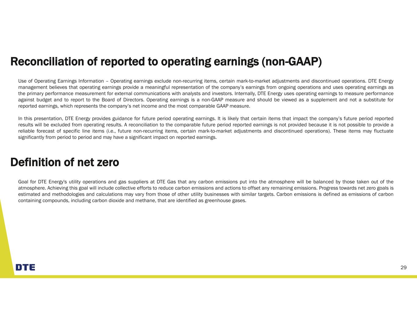 Reconciliation of reported to operating earnings (non-GAAP) 29 Use of Operating Earnings Information – Operating earnings exclude non-recurring items, certain mark-to-market adjustments and discontinued operations. DTE Energy management believes that operating earnings provide a meaningful representation of the company’s earnings from ongoing operations and uses operating earnings as the primary performance measurement for external communications with analysts and investors. Internally, DTE Energy uses operating earnings to measure performance against budget and to report to the Board of Directors. Operating earnings is a non-GAAP measure and should be viewed as a supplement and not a substitute for reported earnings, which represents the company’s net income and the most comparable GAAP measure. In this presentation, DTE Energy provides guidance for future period operating earnings. It is likely that certain items that impact the company’s future period reported results will be excluded from operating results. A reconciliation to the comparable future period reported earnings is not provided because it is not possible to provide a reliable forecast of specific line items (i.e., future non-recurring items, certain mark-to-market adjustments and discontinued operations). These items may fluctuate significantly from period to period and may have a significant impact on reported earnings. Definition of net zero Goal for DTE Energy's utility operations and gas suppliers at DTE Gas that any carbon emissions put into the atmosphere will be balanced by those taken out of the atmosphere. Achieving this goal will include collective efforts to reduce carbon emissions and actions to offset any remaining emissions. Progress towards net zero goals is estimated and methodologies and calculations may vary from those of other utility businesses with similar targets. Carbon emissions is defined as emissions of carbon containing compounds, including carbon dioxide and methane, that are identified as greenhouse gases.