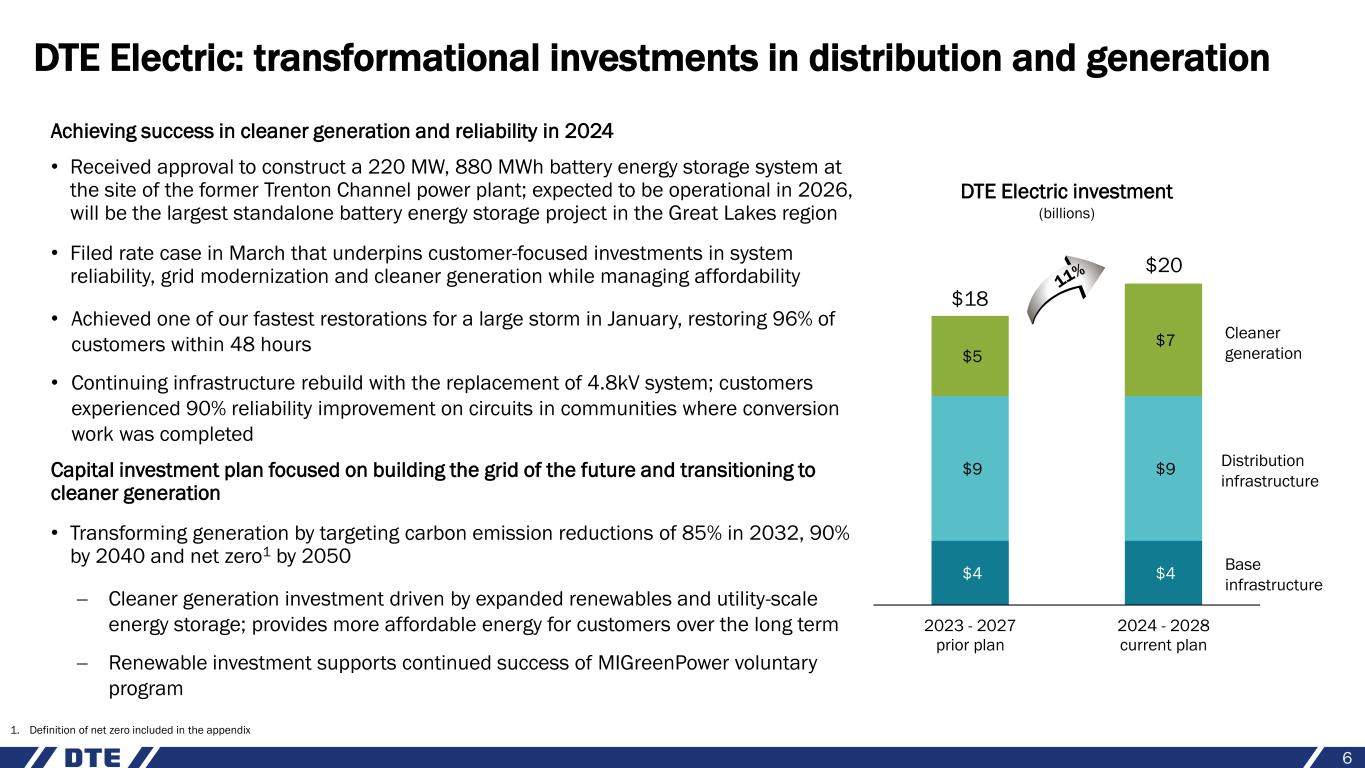 Rate case underpins next step in our $9 billion grid reliability and $7 billion cleaner generation investment commitment while maintaining affordability 5 Committed to improve reliability… • Creating a more reliable grid over the next five years, reducing power outages by 30% and cutting outage time in half by 2029 − Accelerating the deployment of grid automation technology and rebuilding significant portions of aging grid − Upgrading existing infrastructure including stronger poles and fiberglass crossarms which can better withstand extreme weather − Continuing to trim trees around equipment and power lines; trees falling and damaging our equipment accounts for 50% of customer outages …while transitioning to cleaner generation and keeping bill increases below Great Lakes and National average • Transitioning to cleaner generation and ending coal use in 2032 to reduce carbon emissions − Ceasing coal use at Belle River power plant in 2026; converting to a natural gas peaking resource − Retiring two coal units at Monroe power plant in 2028; retiring the remaining two units in 2032 − Repurposing the former Trenton Channel power plant to a battery energy storage system; expected to be operational in 2026 99.88 99.91 99.94 99.97 100.00 Baseline 2024 2025 2026 2027 2028 2029 Targeting above industry median performance by 2029 for average system availability (%) Base investment only 1.2% 5.3% 6.5% DTE Electric Great Lakes average National average Electric bill increase well below national average Average annual residential bill growth since 20201 1. Source: Energy Information Administration (EIA)