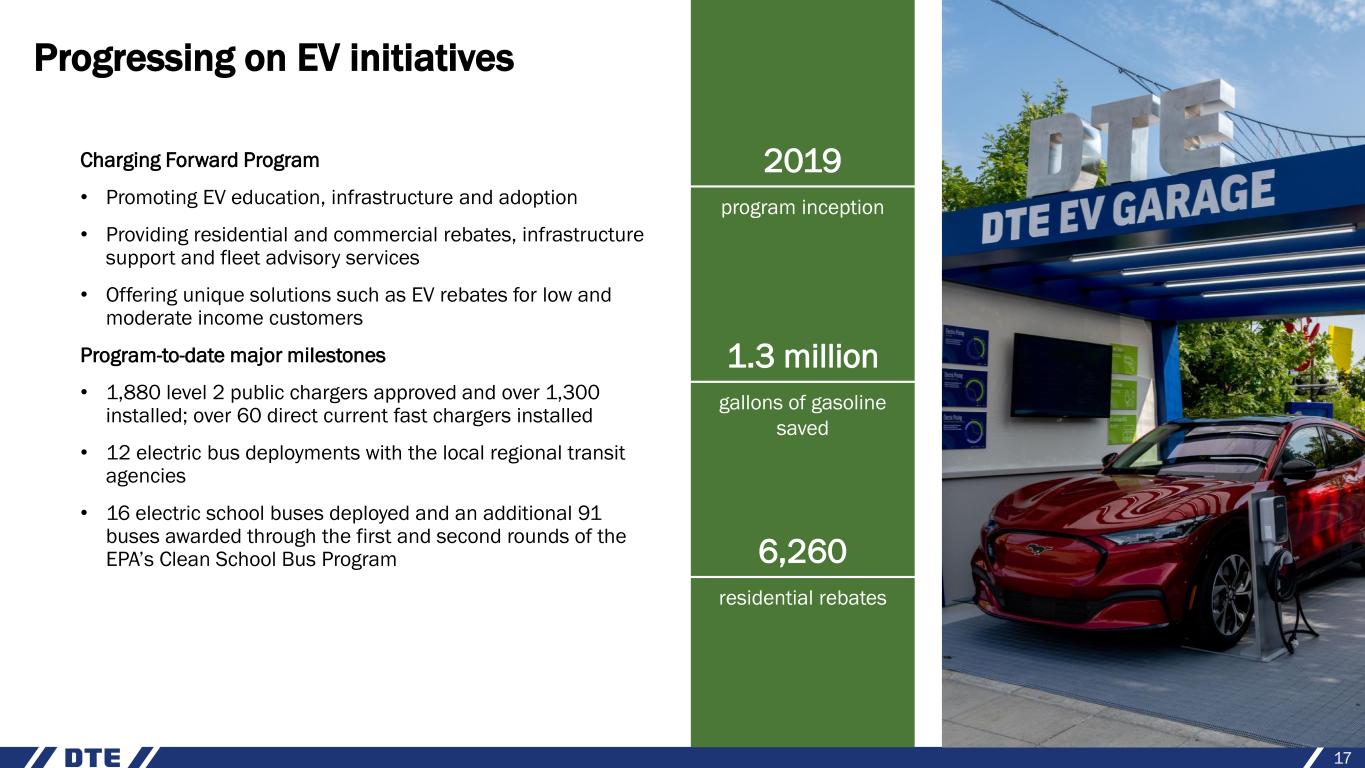 Energy policy drives Michigan’s clean energy future and supports our cleaner energy journey • Accelerates the pace of decarbonization and deployment of renewables − Renewable compliance standard of 50% by 2030 and 60% by 2035 − Clean energy standard of 80% by 2035 and 100% by 2040 − Allows MPSC to approve emerging low and zero carbon technologies, including carbon capture and sequestration − Sets 2,500 MW statewide energy storage target − Raises energy efficiency targets and increases incentives − Provides flexibility in meeting targets and off-ramps for resource adequacy, excessive cost and feasibility − Allows financial compensation mechanism on power purchase agreements for renewable energy and energy storage • Supportive of IRP plan and clean energy goals 16