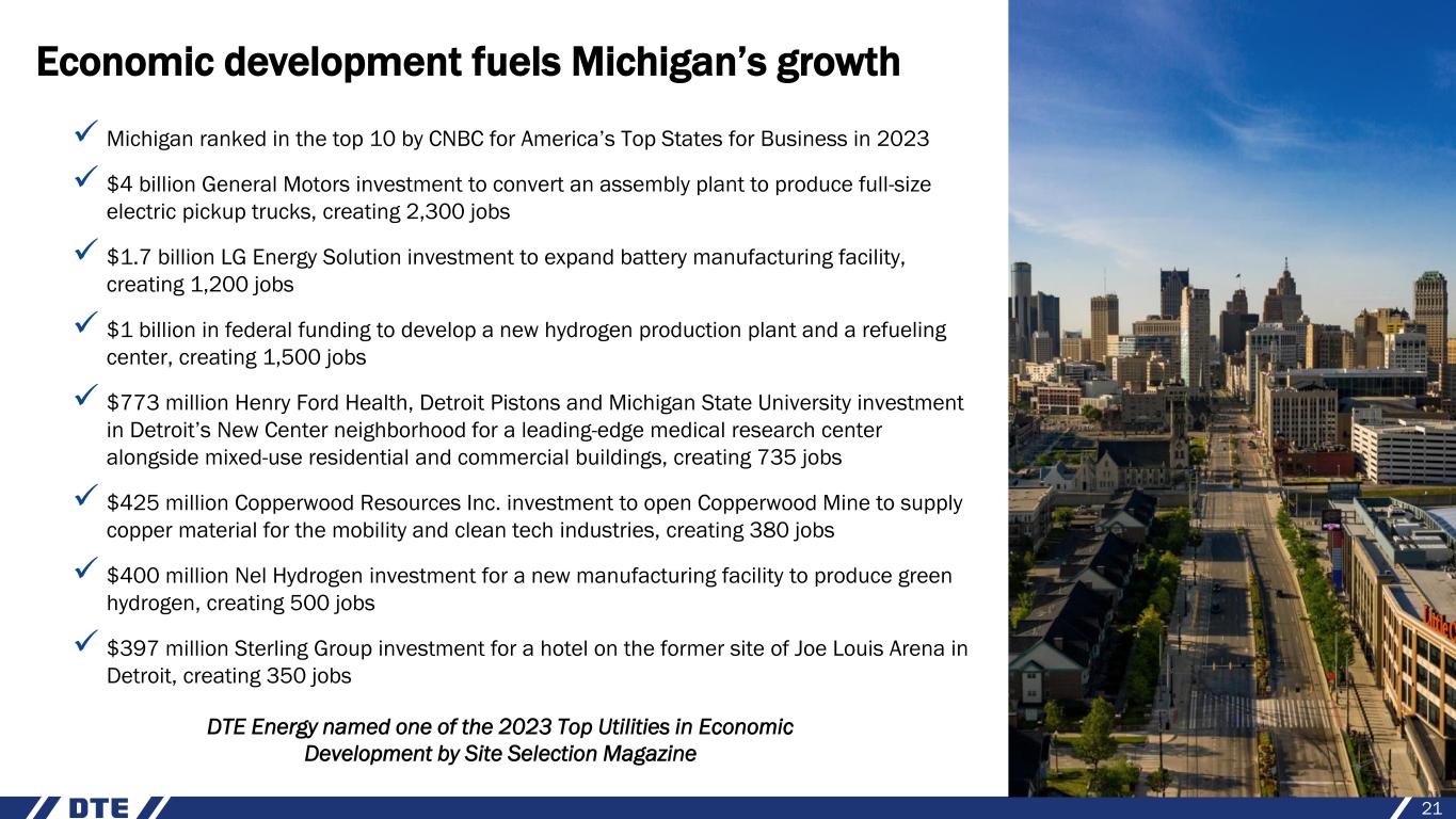 Economic development fuels Michigan’s growth ✓ Michigan ranked in the top 10 by CNBC for America’s Top States for Business in 2023 ✓ $4 billion General Motors investment to convert an assembly plant to produce full-size electric pickup trucks, creating 2,300 jobs ✓ $1.7 billion LG Energy Solution investment to expand battery manufacturing facility, creating 1,200 jobs ✓ $1 billion in federal funding to develop a new hydrogen production plant and a refueling center, creating 1,500 jobs ✓ $773 million Henry Ford Health, Detroit Pistons and Michigan State University investment in Detroit’s New Center neighborhood for a leading-edge medical research center alongside mixed-use residential and commercial buildings, creating 735 jobs ✓ $425 million Copperwood Resources Inc. investment to open Copperwood Mine to supply copper material for the mobility and clean tech industries, creating 380 jobs ✓ $400 million Nel Hydrogen investment for a new manufacturing facility to produce green hydrogen, creating 500 jobs ✓ $397 million Sterling Group investment for a hotel on the former site of Joe Louis Arena in Detroit, creating 350 jobs 21 DTE Energy named one of the 2023 Top Utilities in Economic Development by Site Selection Magazine
