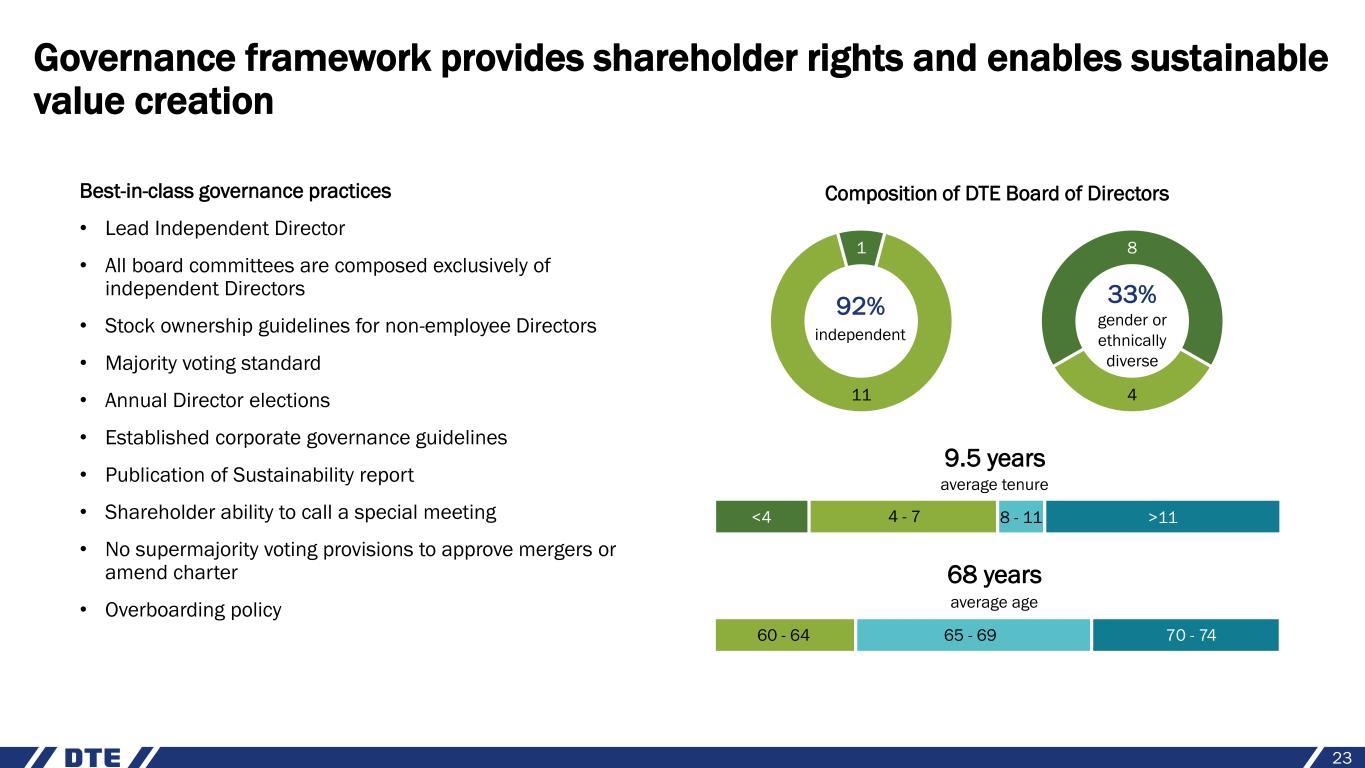 9.5 years average tenure 4 - 7 8 - 11 >11 Governance framework provides shareholder rights and enables sustainable value creation Best-in-class governance practices • Lead Independent Director • All board committees are composed exclusively of independent Directors • Stock ownership guidelines for non-employee Directors • Majority voting standard • Annual Director elections • Established corporate governance guidelines • Publication of Sustainability report • Shareholder ability to call a special meeting • No supermajority voting provisions to approve mergers or amend charter • Overboarding policy 11 1 92% independent 4 8 33% gender or ethnically diverse 65 - 69 70 - 7460 - 64 68 years average age <4 23 Composition of DTE Board of Directors