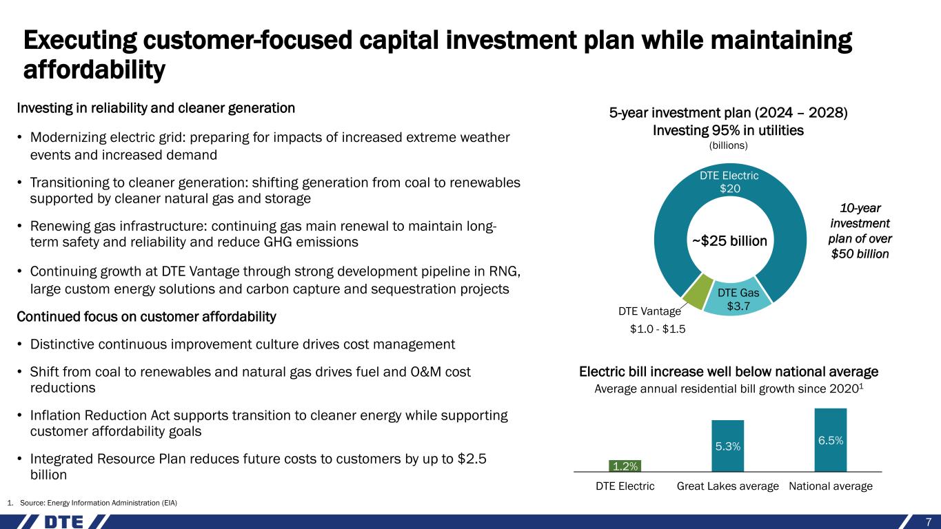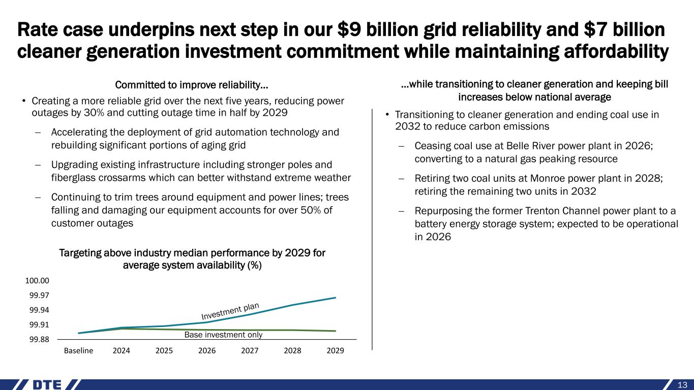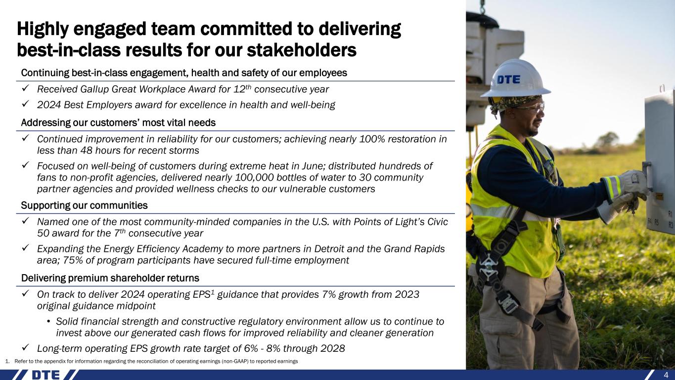 Safe harbor statement 2 The information contained herein is as of the date of this document. DTE Energy expressly disclaims any current intention to update any forward-looking statements contained in this document as a result of new information or future events or developments. Words such as “anticipate,” “believe,” “expect,” “may,” “could,” “projected,” “aspiration,” “plans” and “goals” signify forward-looking statements. Forward-looking statements are not guarantees of future results and conditions but rather are subject to various assumptions, risks and uncertainties that may cause actual future results to be materially different from those contemplated, projected, estimated or budgeted. Many factors may impact forward-looking statements including, but not limited to, the following: the impact of regulation by the EPA, EGLE, the FERC, the MPSC, the NRC, and for DTE Energy, the CFTC and CARB, as well as other applicable governmental proceedings and regulations, including any associated impact on rate structures; the amount and timing of cost recovery allowed as a result of regulatory proceedings, related appeals, or new legislation, including legislative amendments and retail access programs; economic conditions and population changes in our geographic area resulting in changes in demand, customer conservation, and thefts of electricity and, for DTE Energy, natural gas; the operational failure of electric or gas distribution systems or infrastructure; impact of volatility in prices in international steel markets and in prices of environmental attributes generated from renewable natural gas investments on the operations of DTE Vantage; the risk of a major safety incident; environmental issues, laws, regulations, and the increasing costs of remediation and compliance, including actual and potential new federal and state requirements; the cost of protecting assets and customer data against, or damage due to, cyber incidents and terrorism; health, safety, financial, environmental, and regulatory risks associated with ownership and operation of nuclear facilities; volatility in commodity markets, deviations in weather and related risks impacting the results of DTE Energy’s energy trading operations; changes in the cost and availability of coal and other raw materials, purchased power, and natural gas; advances in technology that produce power, store power or reduce power consumption; changes in the financial condition of significant customers and strategic partners; the potential for losses on investments, including nuclear decommissioning trust and benefit plan assets and the related increases in future expense and contributions; access to capital markets and the results of other financing efforts which can be affected by credit agency ratings; instability in capital markets which could impact availability of short and long-term financing; impacts of inflation and the timing and extent of changes in interest rates; the level of borrowings; the potential for increased costs or delays in completion of significant capital projects; changes in, and application of, federal, state, and local tax laws and their interpretations, including the Internal Revenue Code, regulations, rulings, court proceedings, and audits; the effects of weather and other natural phenomena, including climate change, on operations and sales to customers, and purchases from suppliers; unplanned outages at our generation plants; employee relations and the impact of collective bargaining agreements; the availability, cost, coverage, and terms of insurance and stability of insurance providers; cost reduction efforts and the maximization of plant and distribution system performance; the effects of competition; changes in and application of accounting standards and financial reporting regulations; changes in federal or state laws and their interpretation with respect to regulation, energy policy, and other business issues; successful execution of new business development and future growth plans; contract disputes, binding arbitration, litigation, and related appeals; the ability of the electric and gas utilities to achieve net zero emissions goals; and the risks discussed in DTE Energy’s public filings with the Securities and Exchange Commission. New factors emerge from time to time. We cannot predict what factors may arise or how such factors may cause results to differ materially from those contained in any forward-looking statement. Any forward-looking statements speak only as of the date on which such statements are made. We undertake no obligation to update any forward-looking statement to reflect events or circumstances after the date on which such statement is made or to reflect the occurrence of unanticipated events. This document should also be read in conjunction with the Forward-Looking Statements section in DTE Energy’s public filings with the Securities and Exchange Commission.