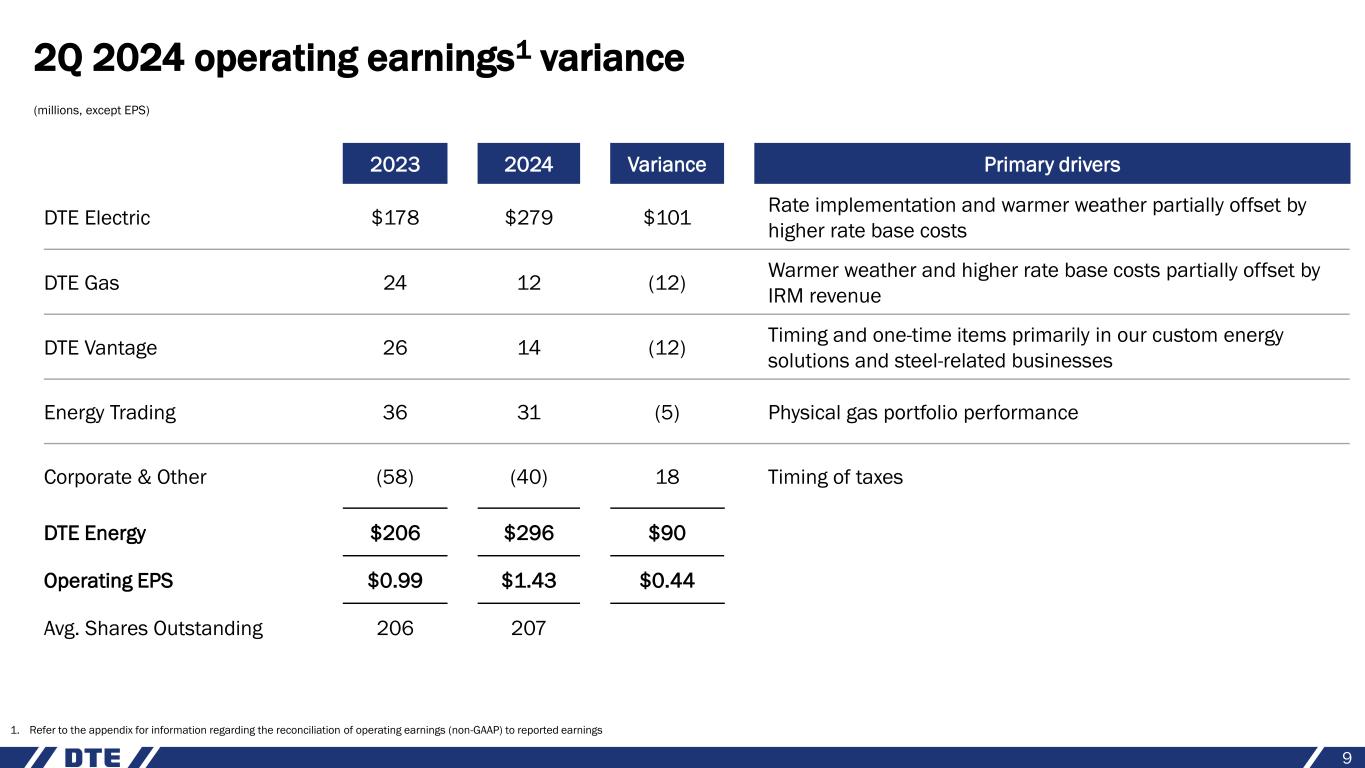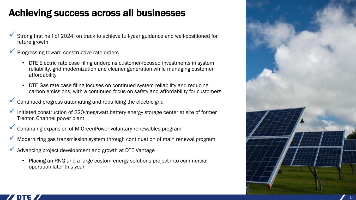 4 Continuing best-in-class engagement, health and safety of our employees ✓ Received Gallup Great Workplace Award for 12th consecutive year ✓ 2024 Best Employers award for excellence in health and well-being Addressing our customers’ most vital needs ✓ Continued improvement in reliability for our customers; achieving nearly 100% restoration in less than 48 hours for recent storms ✓ Focused on well-being of customers during extreme heat in June; distributed hundreds of fans to non-profit agencies, delivered nearly 100,000 bottles of water to 30 community partner agencies and provided wellness checks to our vulnerable customers Supporting our communities ✓ Named one of the most community-minded companies in the U.S. with Points of Light’s Civic 50 award for the 7th consecutive year ✓ Expanding the Energy Efficiency Academy to more partners in Detroit and the Grand Rapids area; 75% of program participants have secured full-time employment Delivering premium shareholder returns ✓ On track to deliver 2024 operating EPS1 guidance that provides 7% growth from 2023 original guidance midpoint • Solid financial strength and constructive regulatory environment allow us to continue to invest above our generated cash flows for improved reliability and cleaner generation ✓ Long-term operating EPS growth rate target of 6% - 8% through 2028 Highly engaged team committed to delivering best-in-class results for our stakeholders 1. Refer to the appendix for information regarding the reconciliation of operating earnings (non-GAAP) to reported earnings