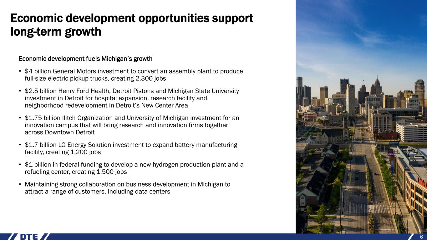Achieving success across all businesses 5 ✓ Strong first half of 2024; on track to achieve full-year guidance and well-positioned for future growth ✓ Progressing toward constructive rate orders • DTE Electric rate case filing underpins customer-focused investments in system reliability, grid modernization and cleaner generation while managing customer affordability • DTE Gas rate case filing focuses on continued system reliability and reducing carbon emissions, with a continued focus on safety and affordability for customers ✓ Continued progress automating and rebuilding the electric grid ✓ Initiated construction of 220-megawatt battery energy storage center at site of former Trenton Channel power plant ✓ Continuing expansion of MIGreenPower voluntary renewables program ✓ Modernizing gas transmission system through continuation of main renewal program ✓ Advancing project development and growth at DTE Vantage • Placing an RNG and a large custom energy solutions project into commercial operation later this year
