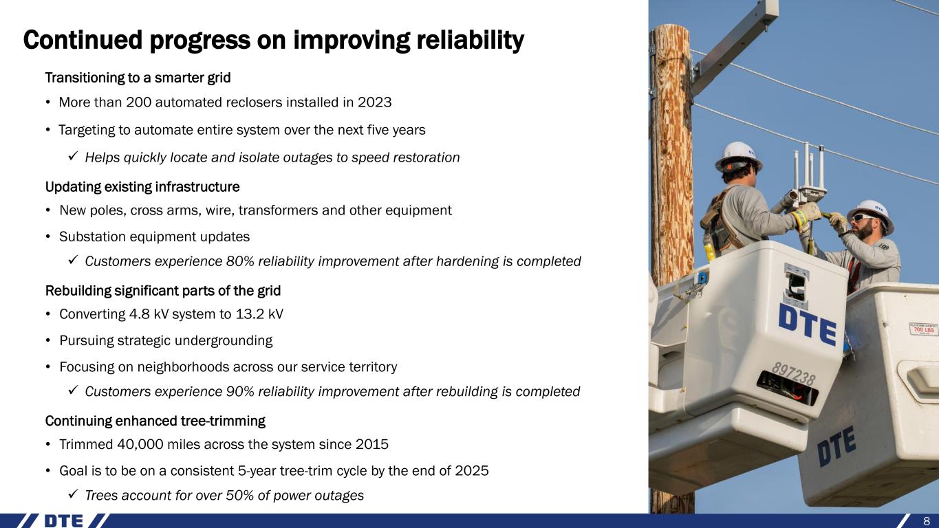 Investing in reliability and cleaner generation • Modernizing electric grid: preparing for impacts of increased extreme weather events and increased demand • Transitioning to cleaner generation: shifting generation from coal to renewables supported by cleaner natural gas and storage • Renewing gas infrastructure: continuing gas main renewal to maintain long- term safety and reliability and reduce GHG emissions • Continuing growth at DTE Vantage through strong development pipeline in RNG, large custom energy solutions and carbon capture and sequestration projects Continued focus on customer affordability • Distinctive continuous improvement culture drives cost management • Shift from coal to renewables and natural gas drives fuel and O&M cost reductions • Inflation Reduction Act supports transition to cleaner energy while supporting customer affordability goals • Integrated Resource Plan reduces future costs to customers by up to $2.5 billion Executing customer-focused capital investment plan while maintaining affordability 7 ~$25 billion DTE Electric DTE Gas DTE Vantage $20 $3.7 $1.0 - $1.5 5-year investment plan (2024 – 2028) Investing 95% in utilities (billions) 10-year investment plan of over $50 billion 1.2% 5.3% 6.5% DTE Electric Great Lakes average National average Electric bill increase well below national average Average annual residential bill growth since 20201 1. Source: Energy Information Administration (EIA)