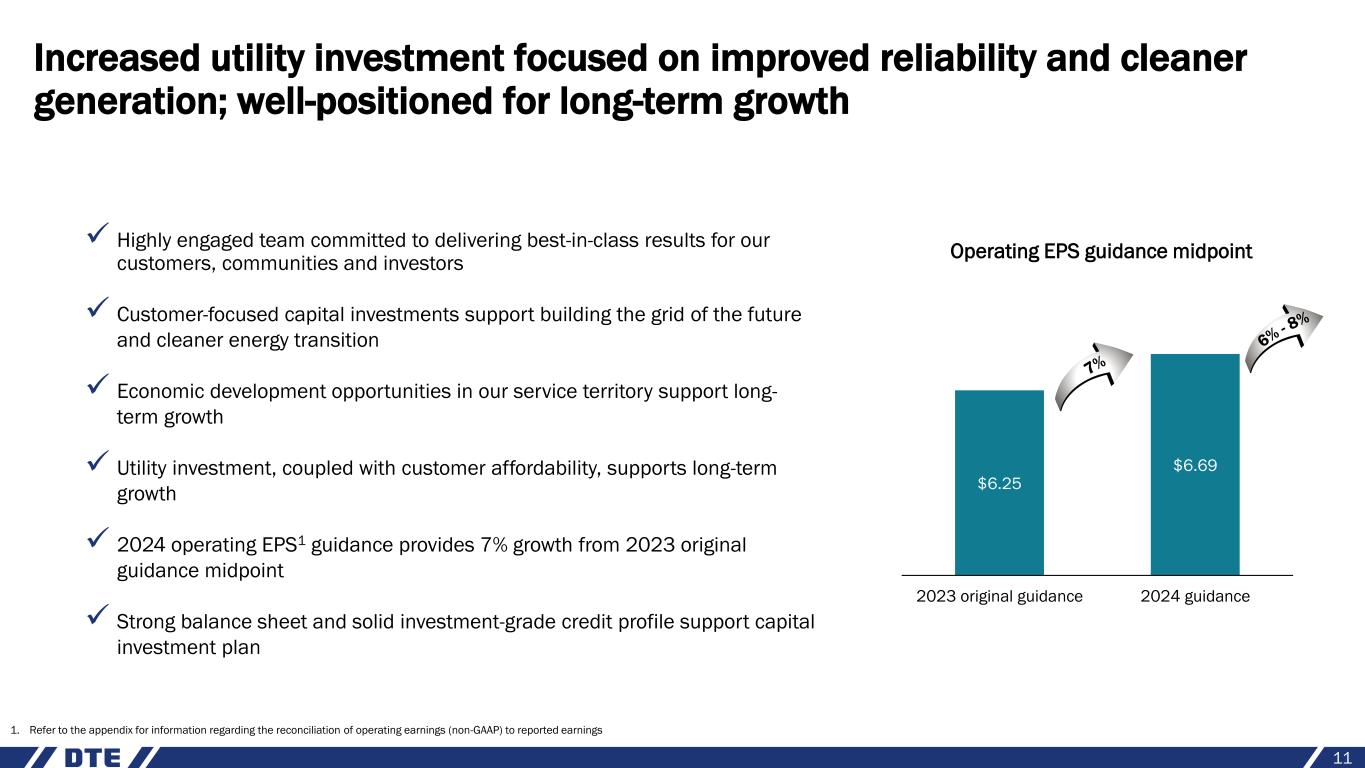 Maintaining strong cash flows, balance sheet and credit profile 10 Credit ratings S&P Moody’s Fitch DTE Energy (unsecured) BBB Baa2 BBB DTE Electric (secured) A Aa3 A+ DTE Gas (secured) A A1 A Strong balance sheet supports robust customer-focused investment agenda • Customer-focused capital investment plan is supported by consistent, healthy cash flows • Targeting minimal equity issuances of $0 - $100 million annually through 2026 • Effectively managing debt maturities to support long-term plan • Maintaining solid investment-grade credit ratings; targeting 15% - 16% FFO / Debt1 1. Funds from Operations (FFO) is calculated using operating earnings, debt excludes a portion of DTE Gas’ short-term debt and considers 50% of the junior subordinated notes as equity
