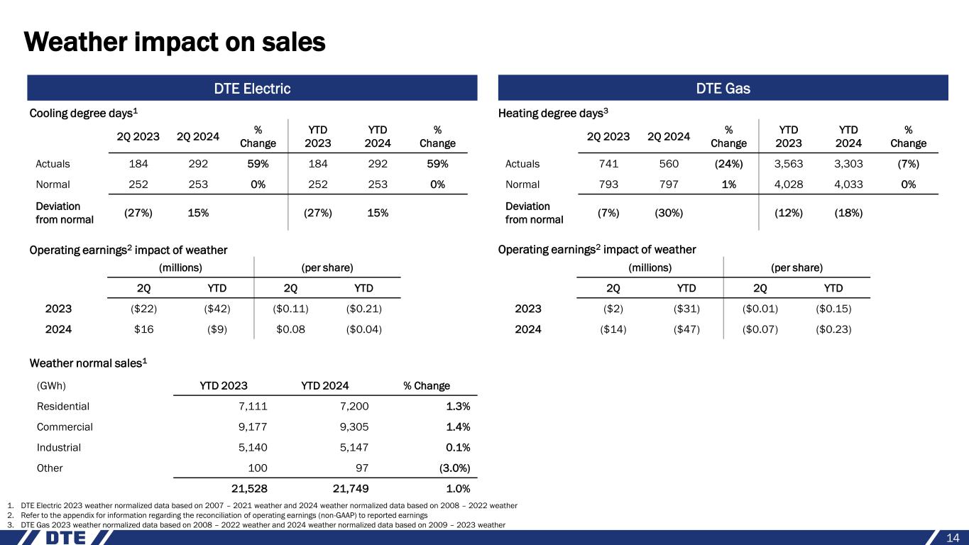 Rate case underpins next step in our $9 billion grid reliability and $7 billion cleaner generation investment commitment while maintaining affordability 13 Committed to improve reliability… • Creating a more reliable grid over the next five years, reducing power outages by 30% and cutting outage time in half by 2029 − Accelerating the deployment of grid automation technology and rebuilding significant portions of aging grid − Upgrading existing infrastructure including stronger poles and fiberglass crossarms which can better withstand extreme weather − Continuing to trim trees around equipment and power lines; trees falling and damaging our equipment accounts for over 50% of customer outages …while transitioning to cleaner generation and keeping bill increases below national average • Transitioning to cleaner generation and ending coal use in 2032 to reduce carbon emissions − Ceasing coal use at Belle River power plant in 2026; converting to a natural gas peaking resource − Retiring two coal units at Monroe power plant in 2028; retiring the remaining two units in 2032 − Repurposing the former Trenton Channel power plant to a battery energy storage system; expected to be operational in 2026 99.88 99.91 99.94 99.97 100.00 Baseline 2024 2025 2026 2027 2028 2029 Targeting above industry median performance by 2029 for average system availability (%) Base investment only