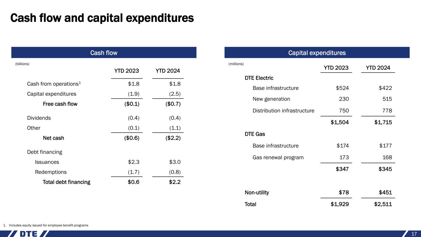 2024 guidance DTE Electric Base infrastructure $630 New generation 1,200 Distribution infrastructure 1,550 $3,380 DTE Gas Base infrastructure $380 Gas renewal program 335 $715 Non-utility $550 - $650 Total $4,645 - $4,745 2024 guidance Cash from operations1 $3.3 Capital expenditures (4.7) Free cash flow ($1.4) Dividends (0.8) Other - Net cash ($2.2) Debt financing Issuances $4.3 Redemptions (2.1) Total debt financing $2.2 Cash flow and capital expenditures guidance 16 (millions) Cash flow Capital expenditures (billions) 1. Includes equity issued for employee benefit programs