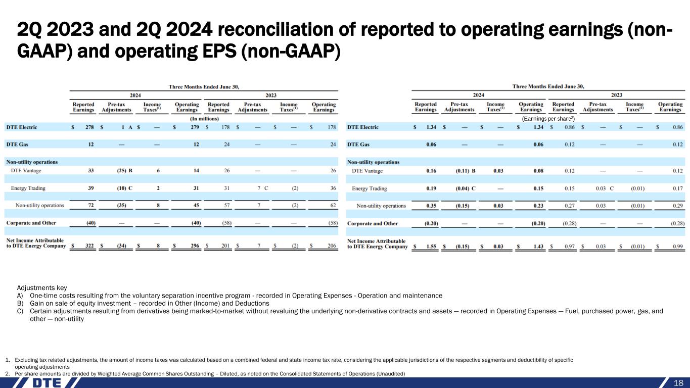 YTD 2023 YTD 2024 DTE Electric Base infrastructure $524 $422 New generation 230 515 Distribution infrastructure 750 778 $1,504 $1,715 DTE Gas Base infrastructure $174 $177 Gas renewal program 173 168 $347 $345 Non-utility $78 $451 Total $1,929 $2,511 YTD 2023 YTD 2024 Cash from operations1 $1.8 $1.8 Capital expenditures (1.9) (2.5) Free cash flow ($0.1) ($0.7) Dividends (0.4) (0.4) Other (0.1) (1.1) Net cash ($0.6) ($2.2) Debt financing Issuances $2.3 $3.0 Redemptions (1.7) (0.8) Total debt financing $0.6 $2.2 Cash flow and capital expenditures 17 (millions) Cash flow Capital expenditures (billions) 1. Includes equity issued for employee benefit programs