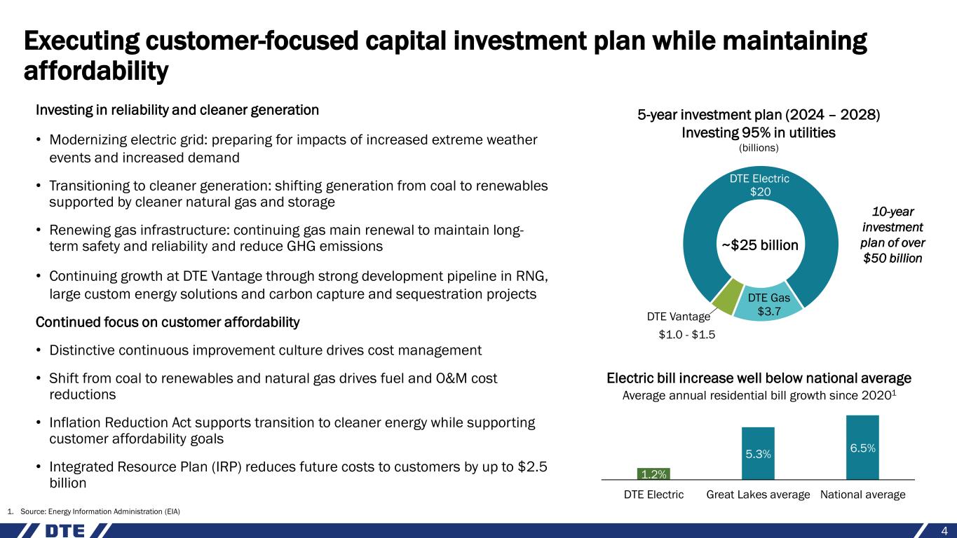 3 Continuing best-in-class engagement, health and safety of our employees ✓ Received Gallup Great Workplace Award for 12th consecutive year ✓ 2024 Best Employers award for excellence in health and well-being Addressing our customers’ most vital needs ✓ Continued improvement in reliability for our customers; achieving nearly 100% restoration in less than 48 hours for recent storms ✓ Focused on well-being of customers during extreme heat in June; distributed hundreds of fans to non-profit agencies, delivered nearly 100,000 bottles of water to 30 community partner agencies and provided wellness checks to our vulnerable customers Supporting our communities ✓ Named one of the most community-minded companies in the U.S. with Points of Light’s Civic 50 award for the 7th consecutive year ✓ Expanding the Energy Efficiency Academy to more partners in Detroit and the Grand Rapids area; 75% of program participants have secured full-time employment Delivering premium shareholder returns ✓ On track to deliver 2024 operating EPS1 guidance that provides 7% growth from 2023 original guidance midpoint • Solid financial strength and constructive regulatory environment allow us to continue to invest above our generated cash flows for improved reliability and cleaner generation ✓ Long-term operating EPS growth rate target of 6% - 8% through 2028 Highly engaged team committed to delivering best-in-class results for our stakeholders 1. Refer to the appendix for information regarding the reconciliation of operating earnings (non-GAAP) to reported earnings