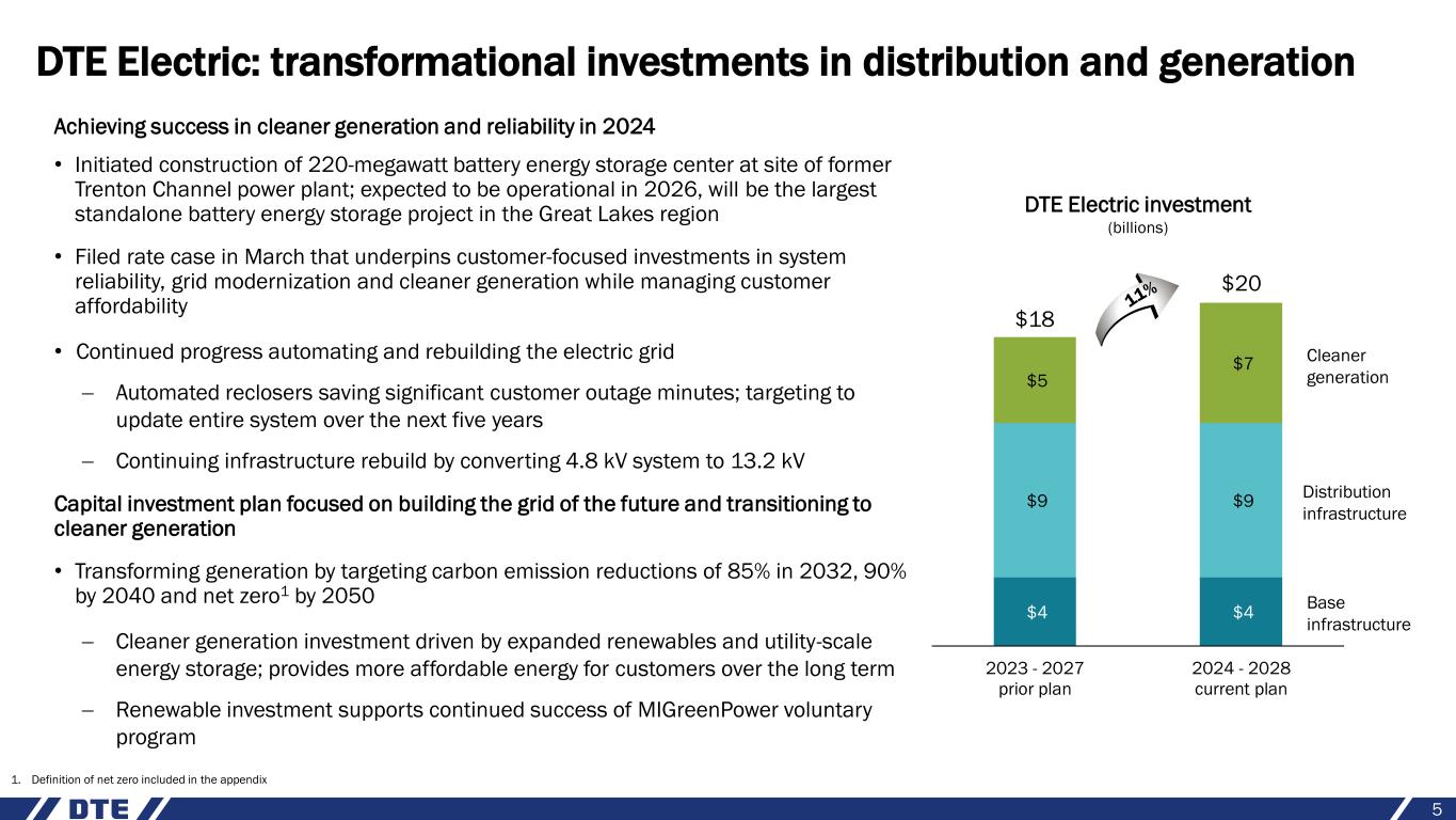 Investing in reliability and cleaner generation • Modernizing electric grid: preparing for impacts of increased extreme weather events and increased demand • Transitioning to cleaner generation: shifting generation from coal to renewables supported by cleaner natural gas and storage • Renewing gas infrastructure: continuing gas main renewal to maintain long- term safety and reliability and reduce GHG emissions • Continuing growth at DTE Vantage through strong development pipeline in RNG, large custom energy solutions and carbon capture and sequestration projects Continued focus on customer affordability • Distinctive continuous improvement culture drives cost management • Shift from coal to renewables and natural gas drives fuel and O&M cost reductions • Inflation Reduction Act supports transition to cleaner energy while supporting customer affordability goals • Integrated Resource Plan (IRP) reduces future costs to customers by up to $2.5 billion Executing customer-focused capital investment plan while maintaining affordability 4 ~$25 billion DTE Electric DTE Gas DTE Vantage $20 $3.7 $1.0 - $1.5 5-year investment plan (2024 – 2028) Investing 95% in utilities (billions) 10-year investment plan of over $50 billion 1.2% 5.3% 6.5% DTE Electric Great Lakes average National average Electric bill increase well below national average Average annual residential bill growth since 20201 1. Source: Energy Information Administration (EIA)