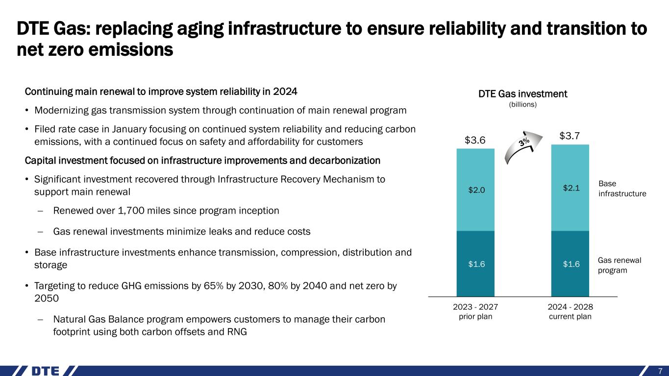 Rate case underpins next step in our $9 billion grid reliability and $7 billion cleaner generation investment commitment while maintaining affordability 6 Committed to improve reliability… • Creating a more reliable grid over the next five years, reducing power outages by 30% and cutting outage time in half by 2029 − Accelerating the deployment of grid automation technology and rebuilding significant portions of aging grid − Upgrading existing infrastructure including stronger poles and fiberglass crossarms which can better withstand extreme weather − Continuing to trim trees around equipment and power lines; trees falling and damaging our equipment accounts for over 50% of customer outages …while transitioning to cleaner generation and keeping bill increases below national average • Transitioning to cleaner generation and ending coal use in 2032 to reduce carbon emissions − Ceasing coal use at Belle River power plant in 2026; converting to a natural gas peaking resource − Retiring two coal units at Monroe power plant in 2028; retiring the remaining two units in 2032 − Repurposing the former Trenton Channel power plant to a battery energy storage system; expected to be operational in 2026 99.88 99.91 99.94 99.97 100.00 Baseline 2024 2025 2026 2027 2028 2029 Targeting above industry median performance by 2029 for average system availability (%) Base investment only
