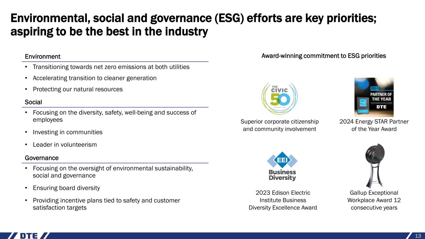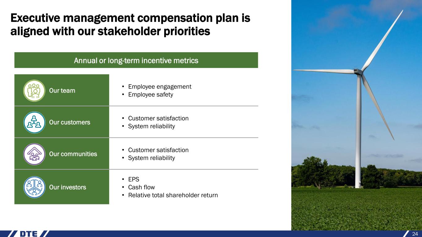 9.5 years average tenure 4 - 7 8 - 11 >11 Governance framework provides shareholder rights and enables sustainable value creation Best-in-class governance practices • Lead Independent Director • All board committees are composed exclusively of independent Directors • Stock ownership guidelines for non-employee Directors • Majority voting standard • Annual Director elections • Established corporate governance guidelines • Publication of Sustainability report • Shareholder ability to call a special meeting • No supermajority voting provisions to approve mergers or amend charter • Overboarding policy 11 1 92% independent 4 8 33% gender or ethnically diverse 65 - 69 70 - 7460 - 64 68 years average age <4 23 Composition of DTE Board of Directors