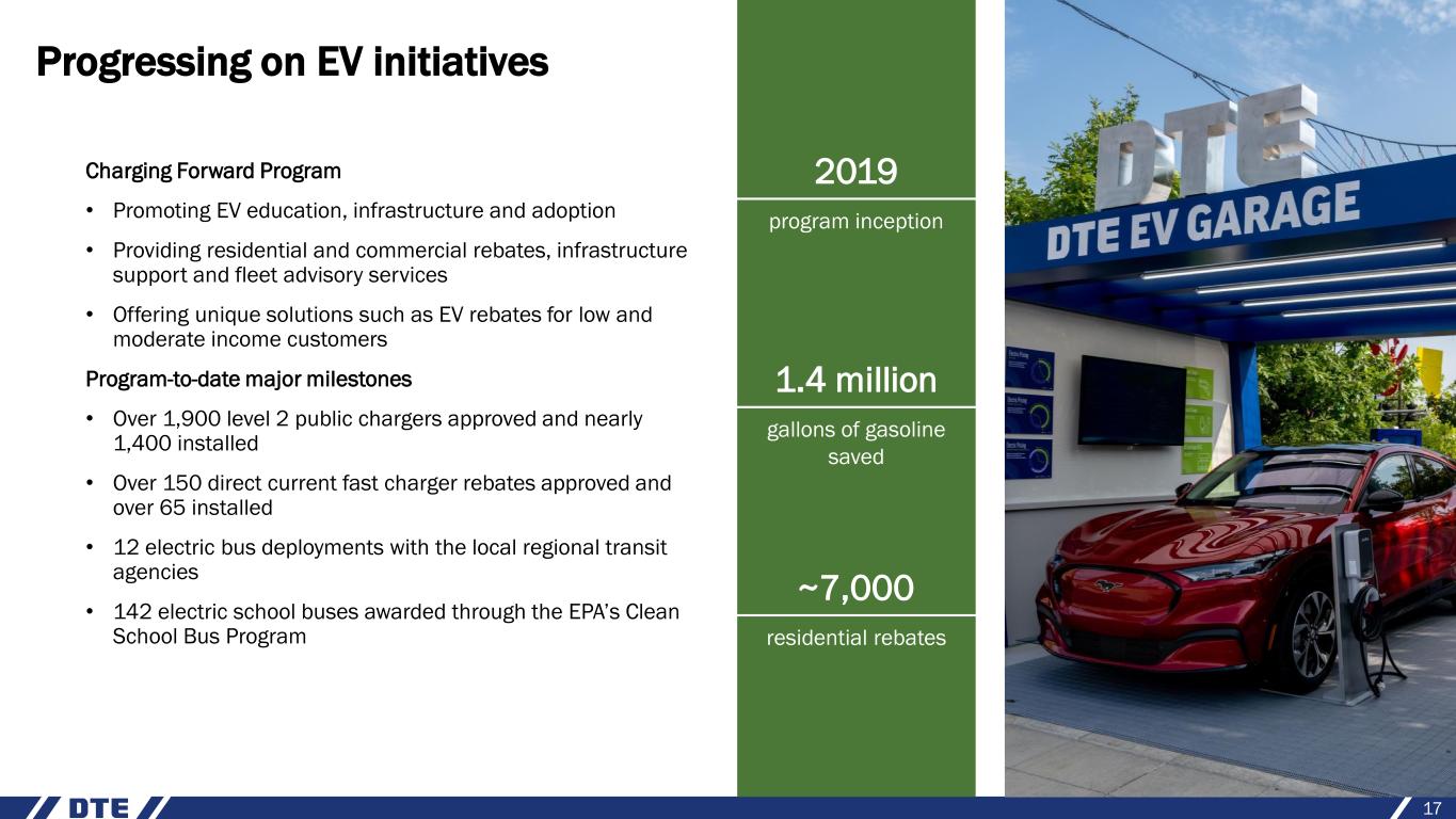 Energy policy drives Michigan’s clean energy future and supports our cleaner energy journey • Accelerates the pace of decarbonization and deployment of renewables − Renewable compliance standard of 50% by 2030 and 60% by 2035 − Clean energy standard of 80% by 2035 and 100% by 2040 − Allows MPSC to approve emerging low and zero carbon technologies, including carbon capture and sequestration − Sets 2,500 MW statewide energy storage target − Raises energy efficiency targets and increases incentives − Provides flexibility in meeting targets and off-ramps for resource adequacy, excessive cost and feasibility − Allows financial compensation mechanism on power purchase agreements for renewable energy and energy storage • Supportive of IRP plan and clean energy goals 16