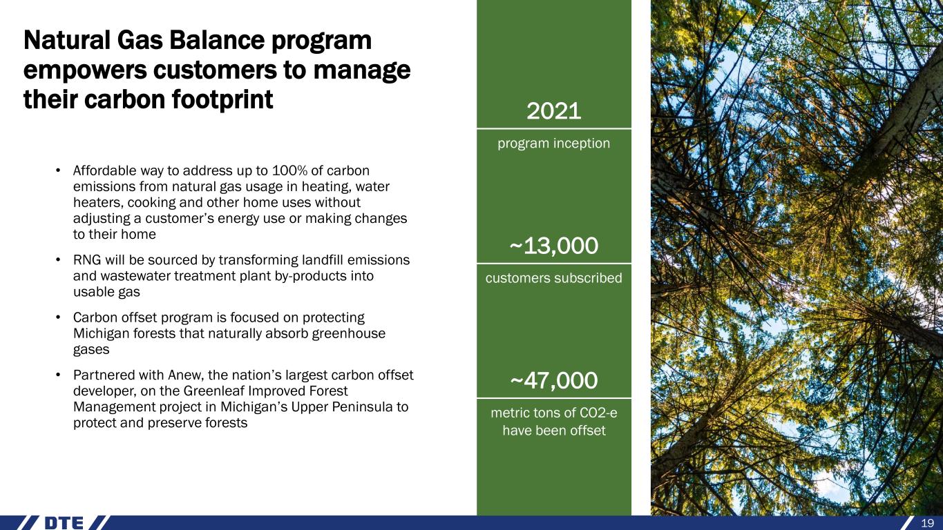 MIGreenPower program continues significant growth ~1,800 business customers ~100,000 residential customers 2,440 MW subscribed • Allows customers to attribute up to 100% of electricity use to renewable sources • Recognized by National Renewable Energy Laboratory as having the largest Green Tariff program in the country, fulfilling more load under contracted subscriptions than any other program • Two largest renewable energy purchases from a utility announced with Ford Motor Company and Stellantis Voluntary renewable customers 18