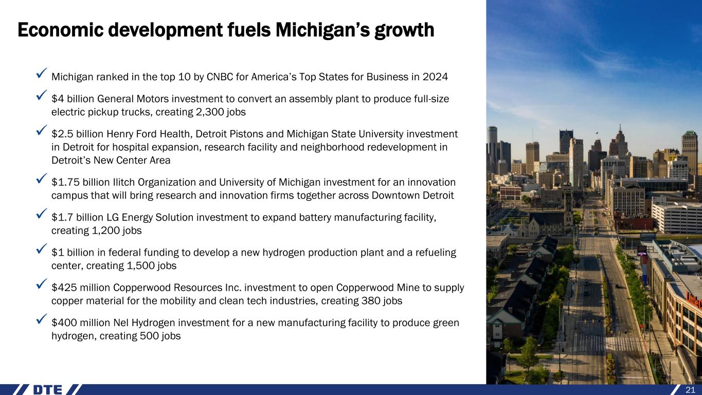 Safe harbor statement 2 The information contained herein is as of the date of this document. DTE Energy expressly disclaims any current intention to update any forward-looking statements contained in this document as a result of new information or future events or developments. Words such as “anticipate,” “believe,” “expect,” “may,” “could,” “projected,” “aspiration,” “plans” and “goals” signify forward-looking statements. Forward-looking statements are not guarantees of future results and conditions but rather are subject to various assumptions, risks and uncertainties that may cause actual future results to be materially different from those contemplated, projected, estimated or budgeted. Many factors may impact forward-looking statements including, but not limited to, the following: the impact of regulation by the EPA, EGLE, the FERC, the MPSC, the NRC, and for DTE Energy, the CFTC and CARB, as well as other applicable governmental proceedings and regulations, including any associated impact on rate structures; the amount and timing of cost recovery allowed as a result of regulatory proceedings, related appeals, or new legislation, including legislative amendments and retail access programs; economic conditions and population changes in our geographic area resulting in changes in demand, customer conservation, and thefts of electricity and, for DTE Energy, natural gas; the operational failure of electric or gas distribution systems or infrastructure; impact of volatility in prices in international steel markets and in prices of environmental attributes generated from renewable natural gas investments on the operations of DTE Vantage; the risk of a major safety incident; environmental issues, laws, regulations, and the increasing costs of remediation and compliance, including actual and potential new federal and state requirements; the cost of protecting assets and customer data against, or damage due to, cyber incidents and terrorism; health, safety, financial, environmental, and regulatory risks associated with ownership and operation of nuclear facilities; volatility in commodity markets, deviations in weather and related risks impacting the results of DTE Energy’s energy trading operations; changes in the cost and availability of coal and other raw materials, purchased power, and natural gas; advances in technology that produce power, store power or reduce power consumption; changes in the financial condition of significant customers and strategic partners; the potential for losses on investments, including nuclear decommissioning trust and benefit plan assets and the related increases in future expense and contributions; access to capital markets and the results of other financing efforts which can be affected by credit agency ratings; instability in capital markets which could impact availability of short and long-term financing; impacts of inflation and the timing and extent of changes in interest rates; the level of borrowings; the potential for increased costs or delays in completion of significant capital projects; changes in, and application of, federal, state, and local tax laws and their interpretations, including the Internal Revenue Code, regulations, rulings, court proceedings, and audits; the effects of weather and other natural phenomena, including climate change, on operations and sales to customers, and purchases from suppliers; unplanned outages at our generation plants; employee relations and the impact of collective bargaining agreements; the availability, cost, coverage, and terms of insurance and stability of insurance providers; cost reduction efforts and the maximization of plant and distribution system performance; the effects of competition; changes in and application of accounting standards and financial reporting regulations; changes in federal or state laws and their interpretation with respect to regulation, energy policy, and other business issues; successful execution of new business development and future growth plans; contract disputes, binding arbitration, litigation, and related appeals; the ability of the electric and gas utilities to achieve net zero emissions goals; and the risks discussed in DTE Energy’s public filings with the Securities and Exchange Commission. New factors emerge from time to time. We cannot predict what factors may arise or how such factors may cause results to differ materially from those contained in any forward-looking statement. Any forward-looking statements speak only as of the date on which such statements are made. We undertake no obligation to update any forward-looking statement to reflect events or circumstances after the date on which such statement is made or to reflect the occurrence of unanticipated events. This document should also be read in conjunction with the Forward-Looking Statements section in DTE Energy’s public filings with the Securities and Exchange Commission.