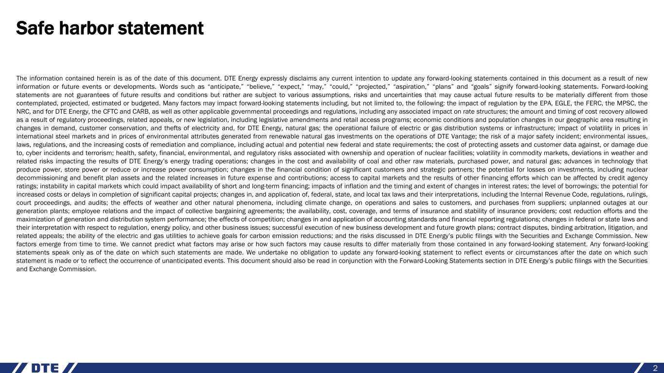 Safe harbor statement 2 The information contained herein is as of the date of this document. DTE Energy expressly disclaims any current intention to update any forward-looking statements contained in this document as a result of new information or future events or developments. Words such as “anticipate,” “believe,” “expect,” “may,” “could,” “projected,” “aspiration,” “plans” and “goals” signify forward-looking statements. Forward-looking statements are not guarantees of future results and conditions but rather are subject to various assumptions, risks and uncertainties that may cause actual future results to be materially different from those contemplated, projected, estimated or budgeted. Many factors may impact forward-looking statements including, but not limited to, the following: the impact of regulation by the EPA, EGLE, the FERC, the MPSC, the NRC, and for DTE Energy, the CFTC and CARB, as well as other applicable governmental proceedings and regulations, including any associated impact on rate structures; the amount and timing of cost recovery allowed as a result of regulatory proceedings, related appeals, or new legislation, including legislative amendments and retail access programs; economic conditions and population changes in our geographic area resulting in changes in demand, customer conservation, and thefts of electricity and, for DTE Energy, natural gas; the operational failure of electric or gas distribution systems or infrastructure; impact of volatility in prices in international steel markets and in prices of environmental attributes generated from renewable natural gas investments on the operations of DTE Vantage; the risk of a major safety incident; environmental issues, laws, regulations, and the increasing costs of remediation and compliance, including actual and potential new federal and state requirements; the cost of protecting assets and customer data against, or damage due to, cyber incidents and terrorism; health, safety, financial, environmental, and regulatory risks associated with ownership and operation of nuclear facilities; volatility in commodity markets, deviations in weather and related risks impacting the results of DTE Energy’s energy trading operations; changes in the cost and availability of coal and other raw materials, purchased power, and natural gas; advances in technology that produce power, store power or reduce or increase power consumption; changes in the financial condition of significant customers and strategic partners; the potential for losses on investments, including nuclear decommissioning and benefit plan assets and the related increases in future expense and contributions; access to capital markets and the results of other financing efforts which can be affected by credit agency ratings; instability in capital markets which could impact availability of short and long-term financing; impacts of inflation and the timing and extent of changes in interest rates; the level of borrowings; the potential for increased costs or delays in completion of significant capital projects; changes in, and application of, federal, state, and local tax laws and their interpretations, including the Internal Revenue Code, regulations, rulings, court proceedings, and audits; the effects of weather and other natural phenomena, including climate change, on operations and sales to customers, and purchases from suppliers; unplanned outages at our generation plants; employee relations and the impact of collective bargaining agreements; the availability, cost, coverage, and terms of insurance and stability of insurance providers; cost reduction efforts and the maximization of generation and distribution system performance; the effects of competition; changes in and application of accounting standards and financial reporting regulations; changes in federal or state laws and their interpretation with respect to regulation, energy policy, and other business issues; successful execution of new business development and future growth plans; contract disputes, binding arbitration, litigation, and related appeals; the ability of the electric and gas utilities to achieve goals for carbon emission reductions; and the risks discussed in DTE Energy’s public filings with the Securities and Exchange Commission. New factors emerge from time to time. We cannot predict what factors may arise or how such factors may cause results to differ materially from those contained in any forward-looking statement. Any forward-looking statements speak only as of the date on which such statements are made. We undertake no obligation to update any forward-looking statement to reflect events or circumstances after the date on which such statement is made or to reflect the occurrence of unanticipated events. This document should also be read in conjunction with the Forward-Looking Statements section in DTE Energy’s public filings with the Securities and Exchange Commission.