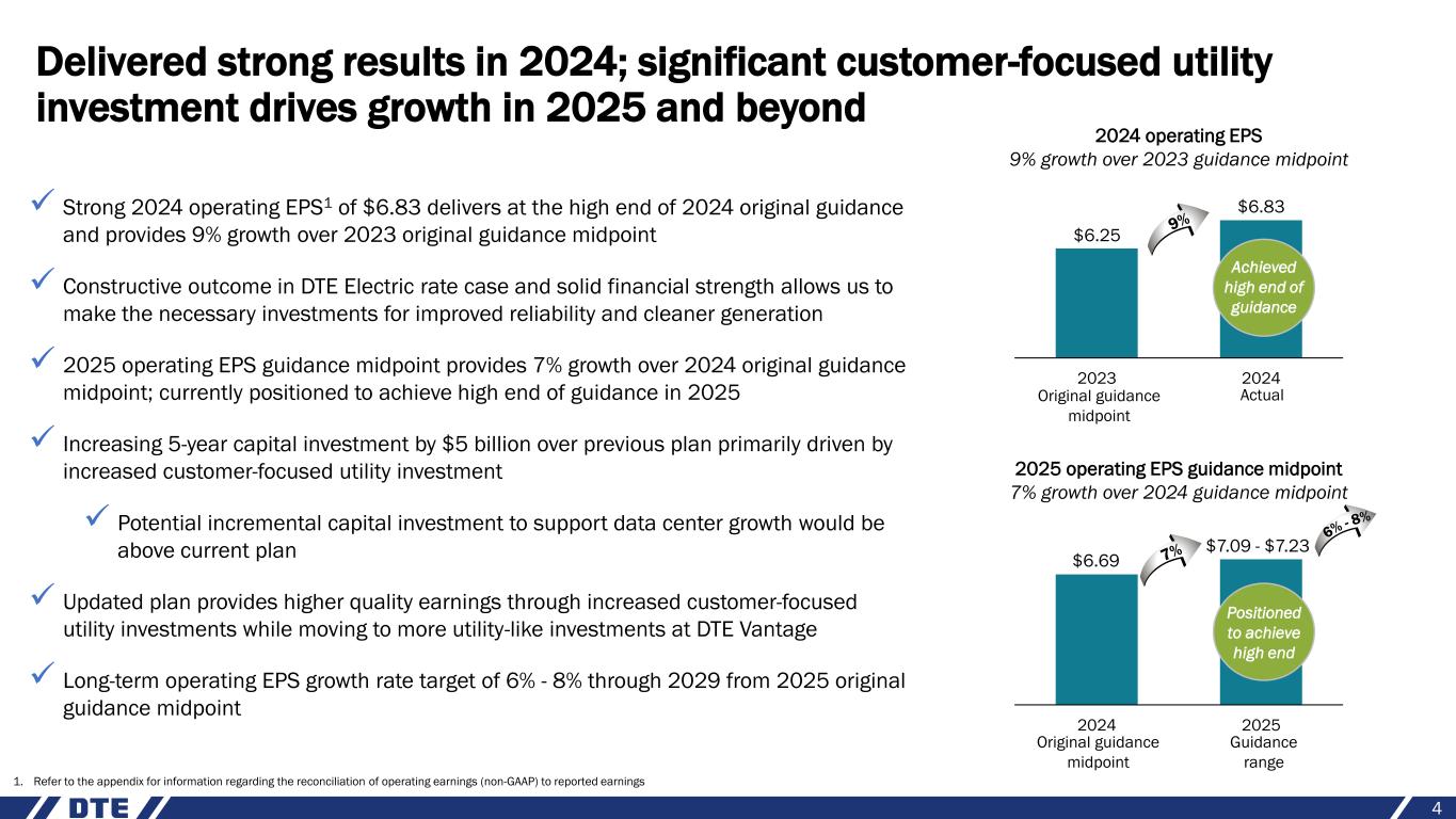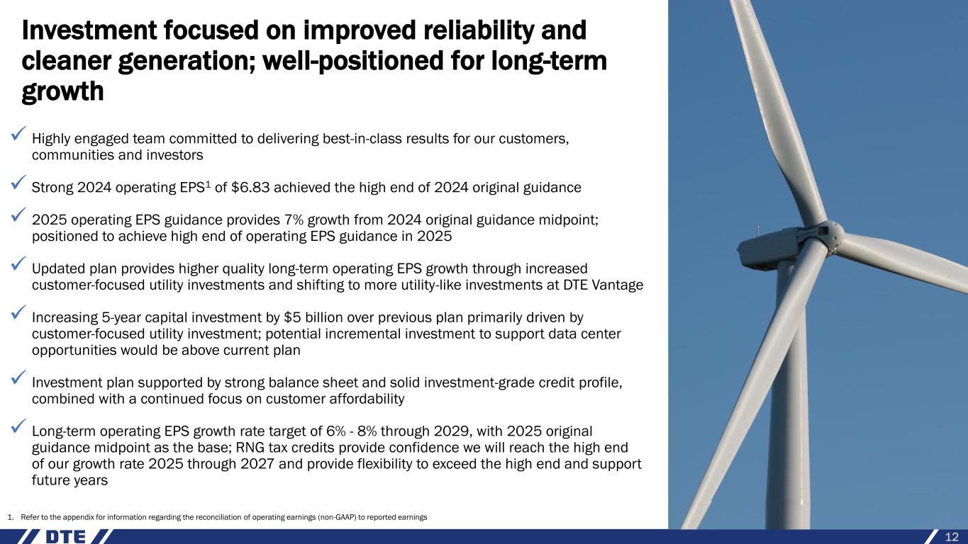 4 1. Refer to the appendix for information regarding the reconciliation of operating earnings (non-GAAP) to reported earnings Delivered strong results in 2024; significant customer-focused utility investment drives growth in 2025 and beyond ✓ Strong 2024 operating EPS1 of $6.83 delivers at the high end of 2024 original guidance and provides 9% growth over 2023 original guidance midpoint ✓ Constructive outcome in DTE Electric rate case and solid financial strength allows us to make the necessary investments for improved reliability and cleaner generation ✓ 2025 operating EPS guidance midpoint provides 7% growth over 2024 original guidance midpoint; currently positioned to achieve high end of guidance in 2025 ✓ Increasing 5-year capital investment by $5 billion over previous plan primarily driven by increased customer-focused utility investment ✓ Potential incremental capital investment to support data center growth would be above current plan ✓ Updated plan provides higher quality earnings through increased customer-focused utility investments while moving to more utility-like investments at DTE Vantage ✓ Long-term operating EPS growth rate target of 6% - 8% through 2029 from 2025 original guidance midpoint 2024 2025 2023 2024 ActualOriginal guidance midpoint 2024 operating EPS 9% growth over 2023 guidance midpoint $6.25 $6.83 Guidance range Original guidance midpoint $6.69 $7.09 - $7.23 2025 operating EPS guidance midpoint 7% growth over 2024 guidance midpoint Positioned to achieve high end Achieved high end of guidance