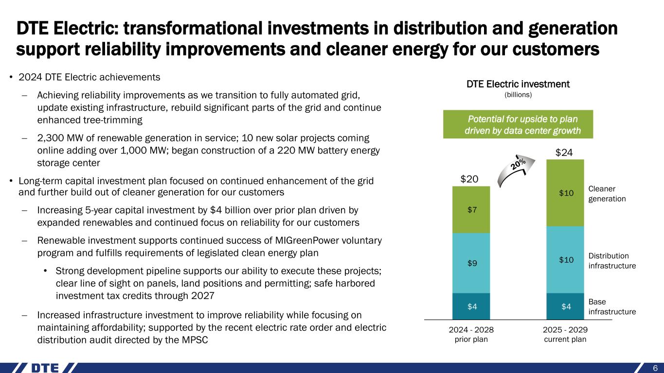 5 Increased customer-focused utility investment, combined with a shift to more utility-like investments at DTE Vantage, provides higher quality 6% - 8% long-term operating EPS1 growth • Increased generation and reliability investment over the next 5 years drives $5 billion increase from prior plan — The overwhelming success of the voluntary renewables program combined with the 2023 IRP settlement and the Michigan Clean Energy legislation drives the need for increased generation investment — Additional grid investment required to improve customer reliability as supported by the recent MPSC electric distribution audit • Increased utility investment provided the flexibility to shift focus of DTE Vantage growth to more utility-like, long-term, fixed-fee contracted projects • Updated plan provides higher quality 6% - 8% operating EPS growth with potential upside — Potential longer-term upside to plan from data center growth — RNG tax credits provide confidence we will reach the high end of our growth rate 2025 through 2027 and provide flexibility to exceed the high end and support future years 5-year investment plan (billions) 1. Refer to the appendix for information regarding the reconciliation of operating earnings (non-GAAP) to reported earnings 2024 - 2028 prior plan 2025 - 2029 current plan $25 $30 DTE Electric DTE Gas DTE Vantage Potential for upside to plan driven by data center growth