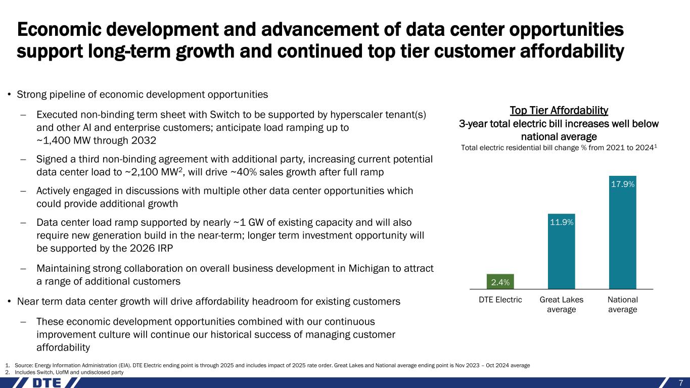 DTE Electric: transformational investments in distribution and generation support reliability improvements and cleaner energy for our customers 6 • 2024 DTE Electric achievements − Achieving reliability improvements as we transition to fully automated grid, update existing infrastructure, rebuild significant parts of the grid and continue enhanced tree-trimming − 2,300 MW of renewable generation in service; 10 new solar projects coming online adding over 1,000 MW; began construction of a 220 MW battery energy storage center • Long-term capital investment plan focused on continued enhancement of the grid and further build out of cleaner generation for our customers − Increasing 5-year capital investment by $4 billion over prior plan driven by expanded renewables and continued focus on reliability for our customers − Renewable investment supports continued success of MIGreenPower voluntary program and fulfills requirements of legislated clean energy plan • Strong development pipeline supports our ability to execute these projects; clear line of sight on panels, land positions and permitting; safe harbored investment tax credits through 2027 − Increased infrastructure investment to improve reliability while focusing on maintaining affordability; supported by the recent electric rate order and electric distribution audit directed by the MPSC $4 $4 $9 $10 $7 $10 2024 - 2028 prior plan 2025 - 2029 current plan Base infrastructure Cleaner generation $20 DTE Electric investment (billions) $24 Distribution infrastructure Potential for upside to plan driven by data center growth