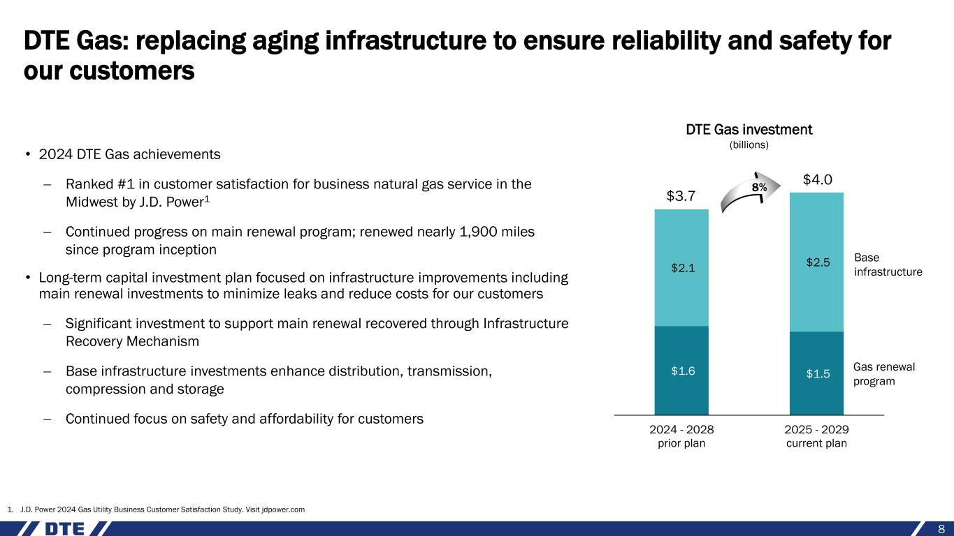 Economic development and advancement of data center opportunities support long-term growth and continued top tier customer affordability 7 • Strong pipeline of economic development opportunities − Executed non-binding term sheet with Switch to be supported by hyperscaler tenant(s) and other AI and enterprise customers; anticipate load ramping up to ~1,400 MW through 2032 − Signed a third non-binding agreement with additional party, increasing current potential data center load to ~2,100 MW2, will drive ~40% sales growth after full ramp − Actively engaged in discussions with multiple other data center opportunities which could provide additional growth − Data center load ramp supported by nearly ~1 GW of existing capacity and will also require new generation build in the near-term; longer term investment opportunity will be supported by the 2026 IRP − Maintaining strong collaboration on overall business development in Michigan to attract a range of additional customers • Near term data center growth will drive affordability headroom for existing customers − These economic development opportunities combined with our continuous improvement culture will continue our historical success of managing customer affordability Top Tier Affordability 3-year total electric bill increases well below national average Total electric residential bill change % from 2021 to 20241 2.4% 11.9% 17.9% DTE Electric Great Lakes average National average 1. Source: Energy Information Administration (EIA). DTE Electric ending point is through 2025 and includes impact of 2025 rate order. Great Lakes and National average ending point is Nov 2023 – Oct 2024 average 2. Includes Switch, UofM and undisclosed party