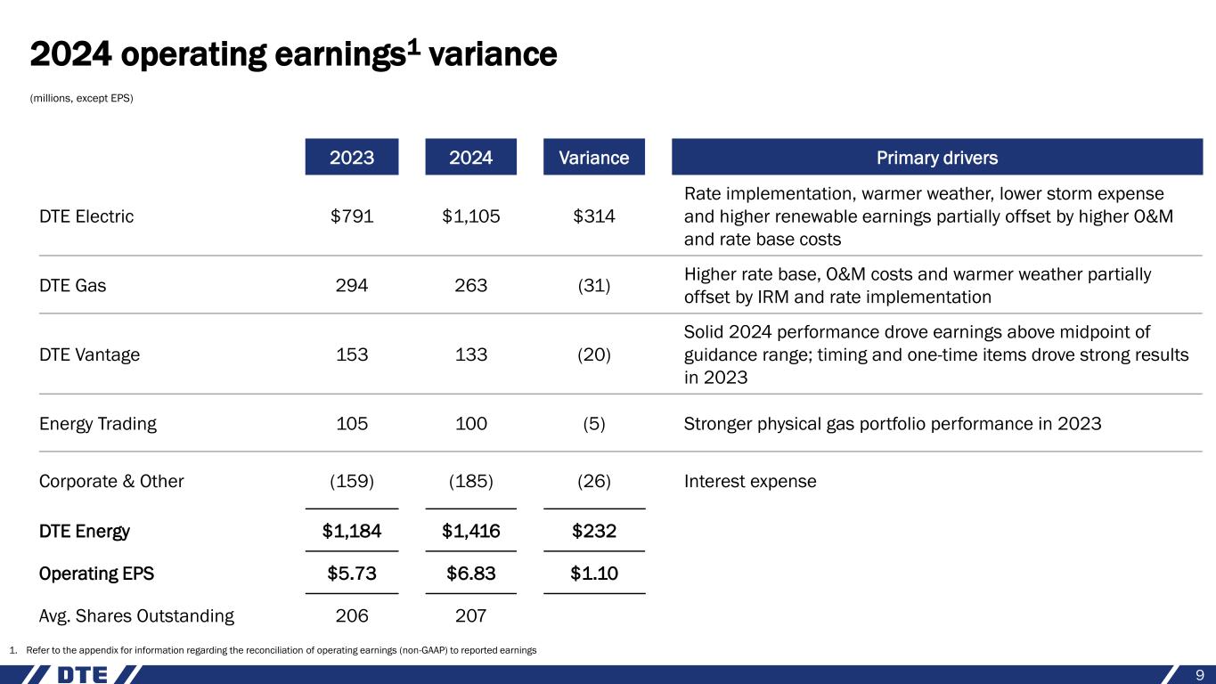 2024 operating earnings1 variance 9 1. Refer to the appendix for information regarding the reconciliation of operating earnings (non-GAAP) to reported earnings 2023 2024 Variance Primary drivers DTE Electric $791 $1,105 $314 Rate implementation, warmer weather, lower storm expense and higher renewable earnings partially offset by higher O&M and rate base costs DTE Gas 294 263 (31) Higher rate base, O&M costs and warmer weather partially offset by IRM and rate implementation DTE Vantage 153 133 (20) Solid 2024 performance drove earnings above midpoint of guidance range; timing and one-time items drove strong results in 2023 Energy Trading 105 100 (5) Stronger physical gas portfolio performance in 2023 Corporate & Other (159) (185) (26) Interest expense DTE Energy $1,184 $1,416 $232 Operating EPS $5.73 $6.83 $1.10 Avg. Shares Outstanding 206 207 (millions, except EPS)