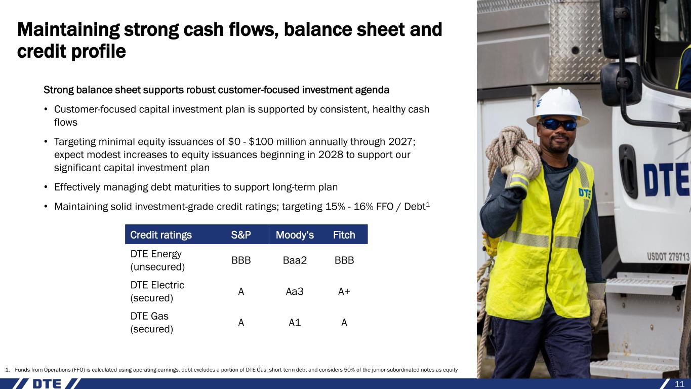 2025 operating EPS1 guidance midpoint provides 7% growth over 2024 original guidance midpoint; positioned to achieve high end 10 (millions, except EPS) 2025 operating earnings DTE Electric $1,205 - $1,225 DTE Gas 310 - 320 DTE Vantage 150 - 160 Energy Trading 50 - 60 Corporate & Other (255) - (245) 1. Reconciliation of operating earnings (non-GAAP) to reported earnings included in the appendix Positioned to achieve high end of operating EPS guidance in 2025 DTE operating earnings guidance $1,475 - $1,505 DTE operating EPS guidance $7.09 - $7.23 • Utility growth driven by customer-focused investment supporting building the grid of the future and cleaner energy transition • DTE Vantage guidance supported by new project development in the custom energy solutions space and production tax credit opportunities • Continued strength in contracted physical power and gas portfolios at Energy Trading