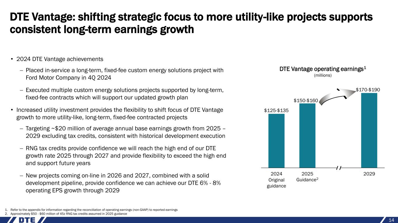 Investment focused on improved reliability and cleaner generation; well-positioned for long-term growth 12 ✓ Highly engaged team committed to delivering best-in-class results for our customers, communities and investors ✓ Strong 2024 operating EPS1 of $6.83 achieved the high end of 2024 original guidance ✓ 2025 operating EPS guidance provides 7% growth from 2024 original guidance midpoint; positioned to achieve high end of operating EPS guidance in 2025 ✓ Updated plan provides higher quality long-term operating EPS growth through increased customer-focused utility investments and shifting to more utility-like investments at DTE Vantage ✓ Increasing 5-year capital investment by $5 billion over previous plan primarily driven by customer-focused utility investment; potential incremental investment to support data center opportunities would be above current plan ✓ Investment plan supported by strong balance sheet and solid investment-grade credit profile, combined with a continued focus on customer affordability ✓ Long-term operating EPS growth rate target of 6% - 8% through 2029, with 2025 original guidance midpoint as the base; RNG tax credits provide confidence we will reach the high end of our growth rate 2025 through 2027 and provide flexibility to exceed the high end and support future years 1. Refer to the appendix for information regarding the reconciliation of operating earnings (non-GAAP) to reported earnings