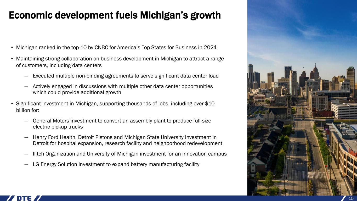 DTE Vantage: shifting strategic focus to more utility-like projects supports consistent long-term earnings growth 1. Refer to the appendix for information regarding the reconciliation of operating earnings (non-GAAP) to reported earnings 2. Approximately $50 - $60 million of 45z RNG tax credits assumed in 2025 guidance 14 • 2024 DTE Vantage achievements − Placed in-service a long-term, fixed-fee custom energy solutions project with Ford Motor Company in 4Q 2024 − Executed multiple custom energy solutions projects supported by long-term, fixed-fee contracts which will support our updated growth plan • Increased utility investment provides the flexibility to shift focus of DTE Vantage growth to more utility-like, long-term, fixed-fee contracted projects − Targeting ~$20 million of average annual base earnings growth from 2025 – 2029 excluding tax credits, consistent with historical development execution − RNG tax credits provide confidence we will reach the high end of our DTE growth rate 2025 through 2027 and provide flexibility to exceed the high end and support future years − New projects coming on-line in 2026 and 2027, combined with a solid development pipeline, provide confidence we can achieve our DTE 6% - 8% operating EPS growth through 2029 2024 2025 2029 Guidance2Original guidance $125-$135 $150-$160 DTE Vantage operating earnings1 (millions) $170-$190