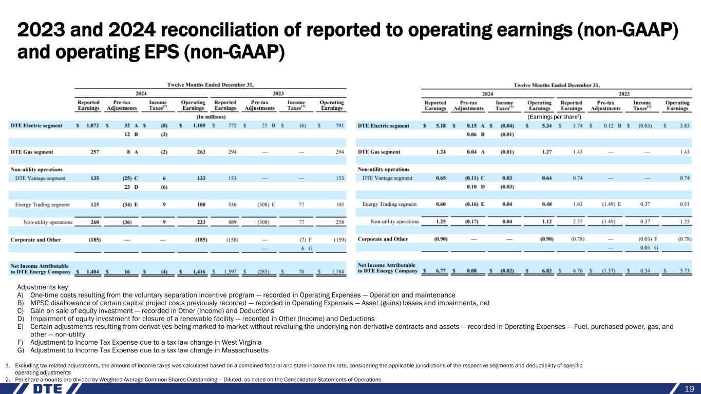 Weather impact on sales 17 Cooling degree days1 Operating earnings2 impact of weather Weather normal sales1 DTE Electric Heating degree days3 Operating earnings2 impact of weather DTE Gas (GWh) 2023 2024 % Change Residential 15,313 15,369 0.4% Commercial 18,923 19,039 0.6% Industrial 10,273 10,125 (1.4%) Other 204 199 (2.5%) 44,713 44,732 0.0% (millions) (per share) 4Q YTD 4Q YTD 2023 ($11) ($106) ($0.05) ($0.52) 2024 ($10) ($31) ($0.05) ($0.15) (millions) (per share) 4Q YTD 4Q YTD 2023 ($20) ($52) ($0.10) ($0.25) 2024 ($12) ($61) ($0.06) ($0.30) 2023 2024 % Change Actuals 703 926 32% Normal 913 915 0% Deviation from normal (23%) 1% 4Q 2023 4Q 2024 % Change 2023 2024 % Change Actuals 1,924 1,948 1% 5,564 5,306 (5%) Normal 2,179 2,140 (2%) 6,319 6,288 0% Deviation from normal (12%) (9%) (12%) (16%) 1. DTE Electric 2023 weather normalized data based on 2007 – 2021 weather and 2024 weather normalized data based on 2008 – 2022 weather 2. Refer to the appendix for information regarding the reconciliation of operating earnings (non-GAAP) to reported earnings 3. DTE Gas 2023 weather normalized data based on 2008 – 2022 weather and 2024 weather normalized data based on 2009 – 2023 weather