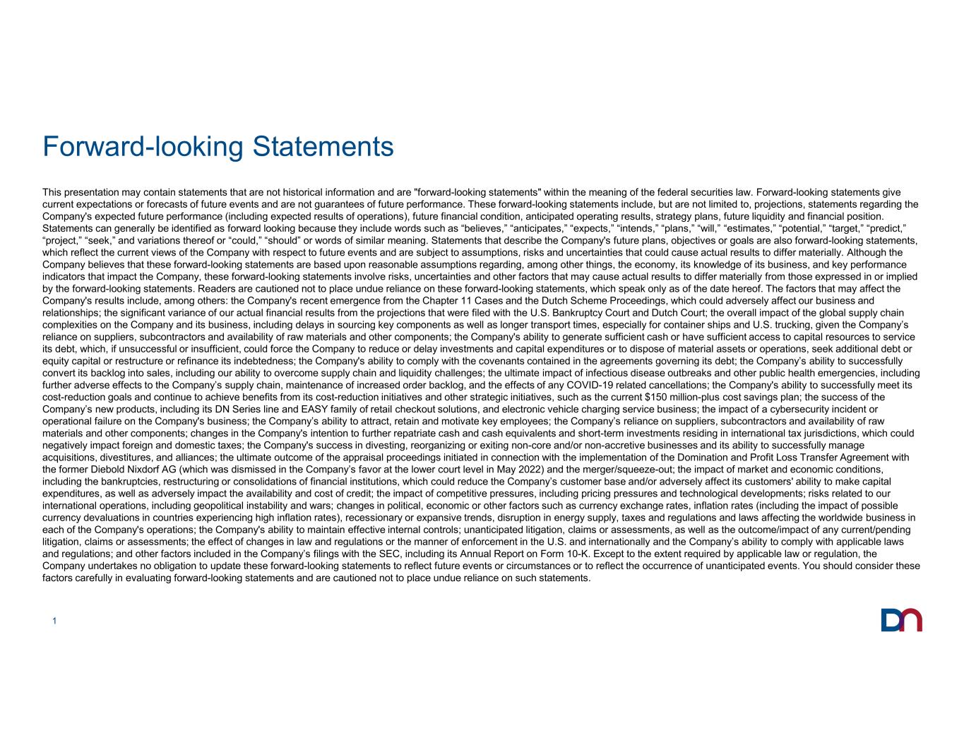 1 This presentation may contain statements that are not historical information and are "forward-looking statements" within the meaning of the federal securities law. Forward-looking statements give current expectations or forecasts of future events and are not guarantees of future performance. These forward-looking statements include, but are not limited to, projections, statements regarding the Company's expected future performance (including expected results of operations), future financial condition, anticipated operating results, strategy plans, future liquidity and financial position. Statements can generally be identified as forward looking because they include words such as “believes,” “anticipates,” “expects,” “intends,” “plans,” “will,” “estimates,” “potential,” “target,” “predict,” “project,” “seek,” and variations thereof or “could,” “should” or words of similar meaning. Statements that describe the Company's future plans, objectives or goals are also forward-looking statements, which reflect the current views of the Company with respect to future events and are subject to assumptions, risks and uncertainties that could cause actual results to differ materially. Although the Company believes that these forward-looking statements are based upon reasonable assumptions regarding, among other things, the economy, its knowledge of its business, and key performance indicators that impact the Company, these forward-looking statements involve risks, uncertainties and other factors that may cause actual results to differ materially from those expressed in or implied by the forward-looking statements. Readers are cautioned not to place undue reliance on these forward-looking statements, which speak only as of the date hereof. The factors that may affect the Company's results include, among others: the Company's recent emergence from the Chapter 11 Cases and the Dutch Scheme Proceedings, which could adversely affect our business and relationships; the significant variance of our actual financial results from the projections that were filed with the U.S. Bankruptcy Court and Dutch Court; the overall impact of the global supply chain complexities on the Company and its business, including delays in sourcing key components as well as longer transport times, especially for container ships and U.S. trucking, given the Company’s reliance on suppliers, subcontractors and availability of raw materials and other components; the Company's ability to generate sufficient cash or have sufficient access to capital resources to service its debt, which, if unsuccessful or insufficient, could force the Company to reduce or delay investments and capital expenditures or to dispose of material assets or operations, seek additional debt or equity capital or restructure or refinance its indebtedness; the Company's ability to comply with the covenants contained in the agreements governing its debt; the Company’s ability to successfully convert its backlog into sales, including our ability to overcome supply chain and liquidity challenges; the ultimate impact of infectious disease outbreaks and other public health emergencies, including further adverse effects to the Company’s supply chain, maintenance of increased order backlog, and the effects of any COVID-19 related cancellations; the Company's ability to successfully meet its cost-reduction goals and continue to achieve benefits from its cost-reduction initiatives and other strategic initiatives, such as the current $150 million-plus cost savings plan; the success of the Company’s new products, including its DN Series line and EASY family of retail checkout solutions, and electronic vehicle charging service business; the impact of a cybersecurity incident or operational failure on the Company's business; the Company’s ability to attract, retain and motivate key employees; the Company’s reliance on suppliers, subcontractors and availability of raw materials and other components; changes in the Company's intention to further repatriate cash and cash equivalents and short-term investments residing in international tax jurisdictions, which could negatively impact foreign and domestic taxes; the Company's success in divesting, reorganizing or exiting non-core and/or non-accretive businesses and its ability to successfully manage acquisitions, divestitures, and alliances; the ultimate outcome of the appraisal proceedings initiated in connection with the implementation of the Domination and Profit Loss Transfer Agreement with the former Diebold Nixdorf AG (which was dismissed in the Company’s favor at the lower court level in May 2022) and the merger/squeeze-out; the impact of market and economic conditions, including the bankruptcies, restructuring or consolidations of financial institutions, which could reduce the Company’s customer base and/or adversely affect its customers' ability to make capital expenditures, as well as adversely impact the availability and cost of credit; the impact of competitive pressures, including pricing pressures and technological developments; risks related to our international operations, including geopolitical instability and wars; changes in political, economic or other factors such as currency exchange rates, inflation rates (including the impact of possible currency devaluations in countries experiencing high inflation rates), recessionary or expansive trends, disruption in energy supply, taxes and regulations and laws affecting the worldwide business in each of the Company's operations; the Company's ability to maintain effective internal controls; unanticipated litigation, claims or assessments, as well as the outcome/impact of any current/pending litigation, claims or assessments; the effect of changes in law and regulations or the manner of enforcement in the U.S. and internationally and the Company’s ability to comply with applicable laws and regulati
