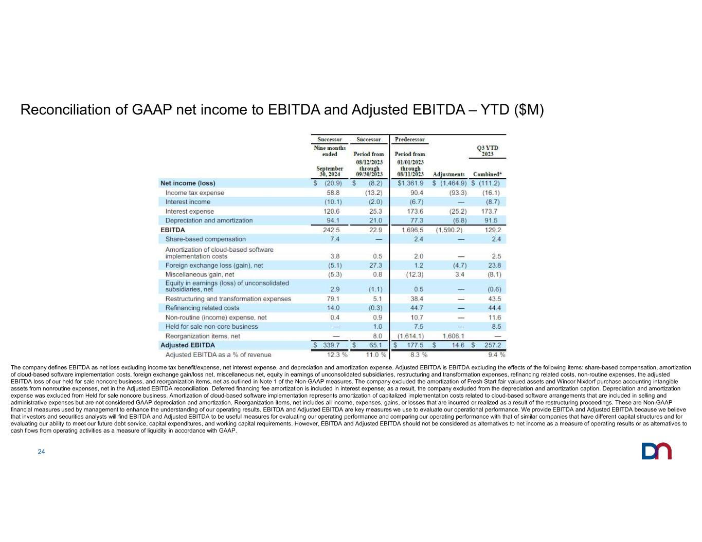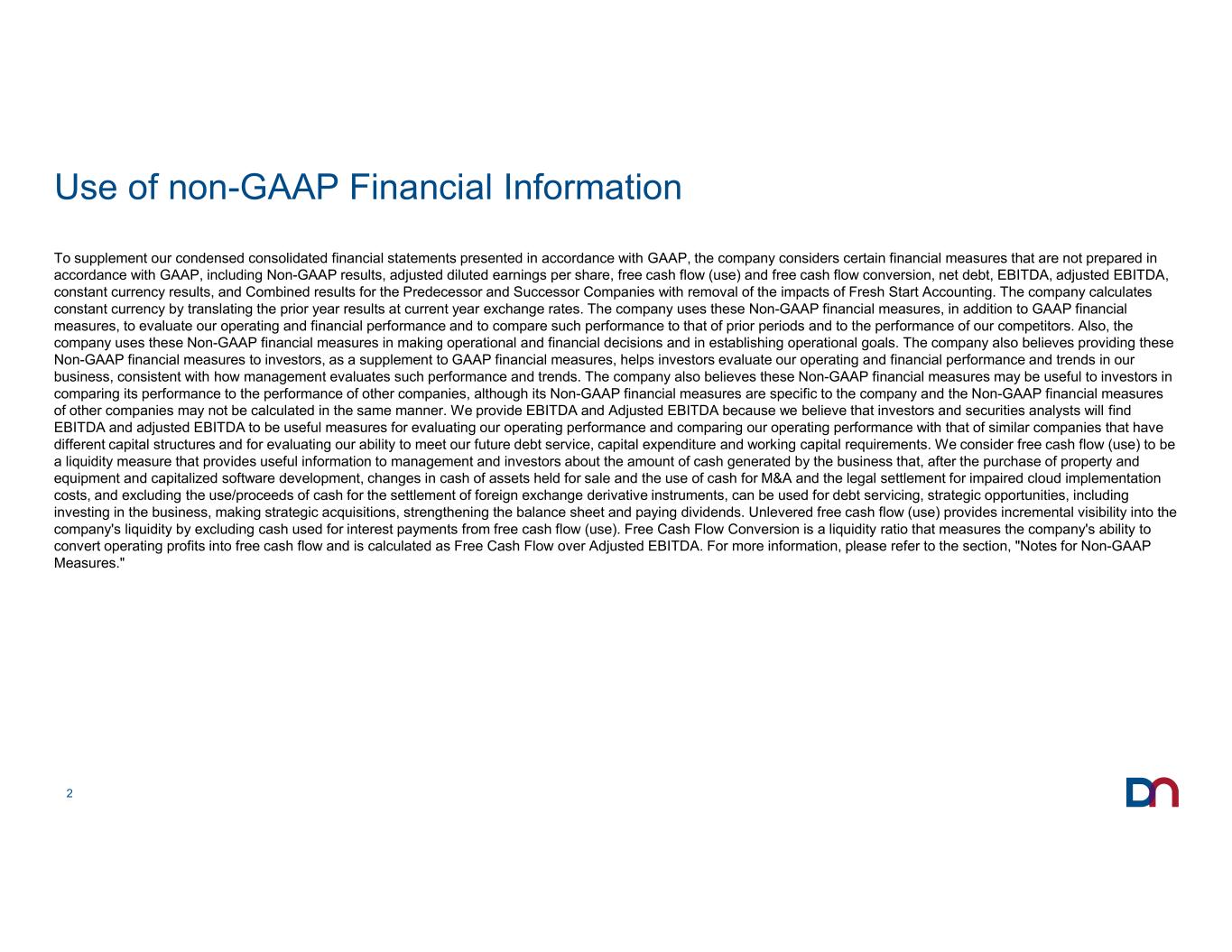2 Use of non-GAAP Financial Information To supplement our condensed consolidated financial statements presented in accordance with GAAP, the company considers certain financial measures that are not prepared in accordance with GAAP, including Non-GAAP results, adjusted diluted earnings per share, free cash flow (use) and free cash flow conversion, net debt, EBITDA, adjusted EBITDA, constant currency results, and Combined results for the Predecessor and Successor Companies with removal of the impacts of Fresh Start Accounting. The company calculates constant currency by translating the prior year results at current year exchange rates. The company uses these Non-GAAP financial measures, in addition to GAAP financial measures, to evaluate our operating and financial performance and to compare such performance to that of prior periods and to the performance of our competitors. Also, the company uses these Non-GAAP financial measures in making operational and financial decisions and in establishing operational goals. The company also believes providing these Non-GAAP financial measures to investors, as a supplement to GAAP financial measures, helps investors evaluate our operating and financial performance and trends in our business, consistent with how management evaluates such performance and trends. The company also believes these Non-GAAP financial measures may be useful to investors in comparing its performance to the performance of other companies, although its Non-GAAP financial measures are specific to the company and the Non-GAAP financial measures of other companies may not be calculated in the same manner. We provide EBITDA and Adjusted EBITDA because we believe that investors and securities analysts will find EBITDA and adjusted EBITDA to be useful measures for evaluating our operating performance and comparing our operating performance with that of similar companies that have different capital structures and for evaluating our ability to meet our future debt service, capital expenditure and working capital requirements. We consider free cash flow (use) to be a liquidity measure that provides useful information to management and investors about the amount of cash generated by the business that, after the purchase of property and equipment and capitalized software development, changes in cash of assets held for sale and the use of cash for M&A and the legal settlement for impaired cloud implementation costs, and excluding the use/proceeds of cash for the settlement of foreign exchange derivative instruments, can be used for debt servicing, strategic opportunities, including investing in the business, making strategic acquisitions, strengthening the balance sheet and paying dividends. Unlevered free cash flow (use) provides incremental visibility into the company's liquidity by excluding cash used for interest payments from free cash flow (use). Free Cash Flow Conversion is a liquidity ratio that measures the company's ability to convert operating profits into free cash flow and is calculated as Free Cash Flow over Adjusted EBITDA. For more information, please refer to the section, "Notes for Non-GAAP Measures."