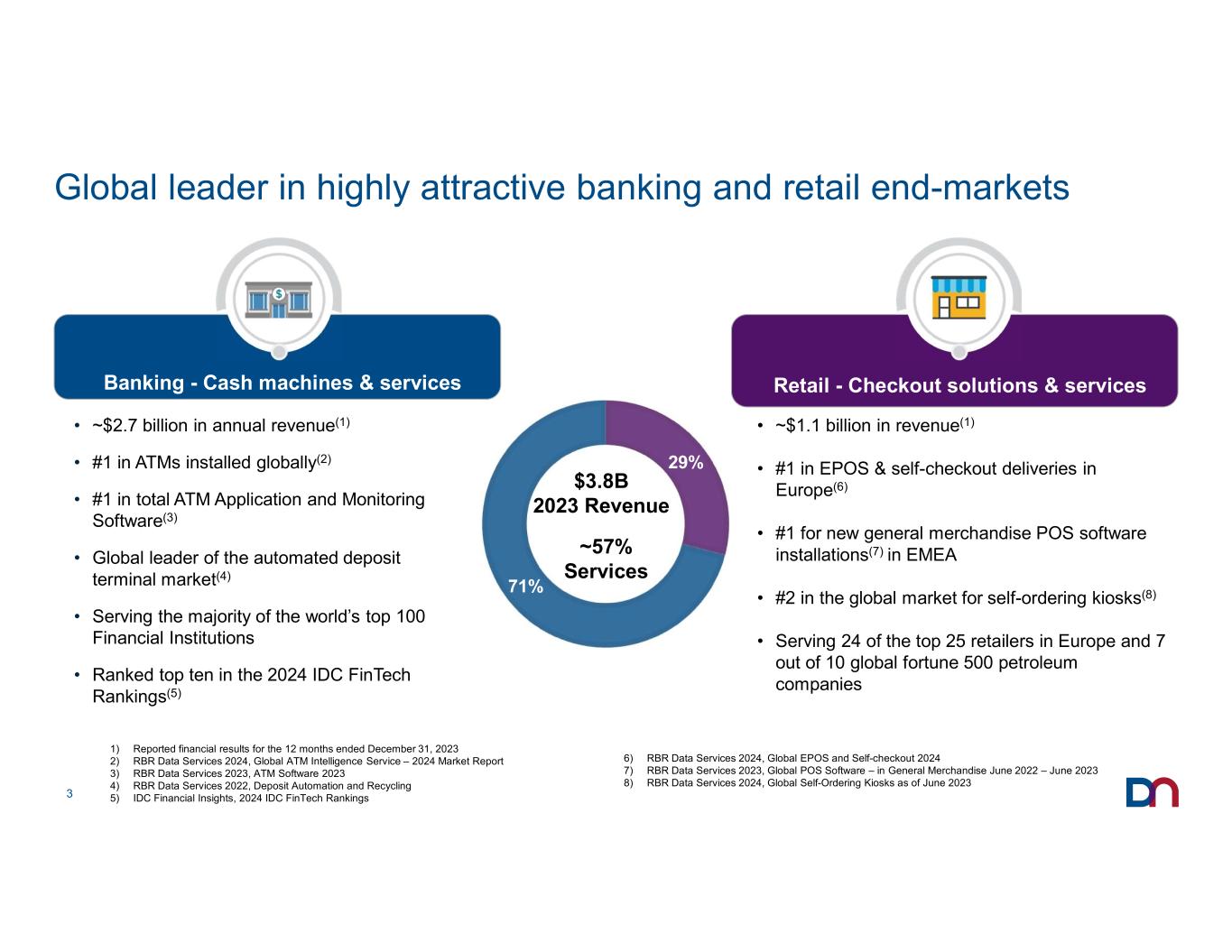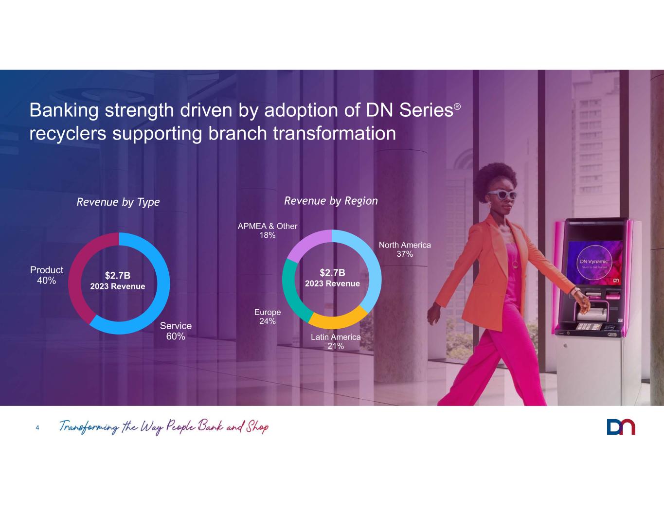 3 Global leader in highly attractive banking and retail end-markets Banking - Cash machines & services • ~$1.1 billion in revenue(1) • #1 in EPOS & self-checkout deliveries in Europe(6) • #1 for new general merchandise POS software installations(7) in EMEA • #2 in the global market for self-ordering kiosks(8) • Serving 24 of the top 25 retailers in Europe and 7 out of 10 global fortune 500 petroleum companies 29% 71% $3.8B 2023 Revenue ~57% Services • ~$2.7 billion in annual revenue(1) • #1 in ATMs installed globally(2) • #1 in total ATM Application and Monitoring Software(3) • Global leader of the automated deposit terminal market(4) • Serving the majority of the world’s top 100 Financial Institutions • Ranked top ten in the 2024 IDC FinTech Rankings(5) Retail - Checkout solutions & services 1) Reported financial results for the 12 months ended December 31, 2023 2) RBR Data Services 2024, Global ATM Intelligence Service – 2024 Market Report 3) RBR Data Services 2023, ATM Software 2023 4) RBR Data Services 2022, Deposit Automation and Recycling 5) IDC Financial Insights, 2024 IDC FinTech Rankings 6) RBR Data Services 2024, Global EPOS and Self-checkout 2024 7) RBR Data Services 2023, Global POS Software – in General Merchandise June 2022 – June 2023 8) RBR Data Services 2024, Global Self-Ordering Kiosks as of June 2023