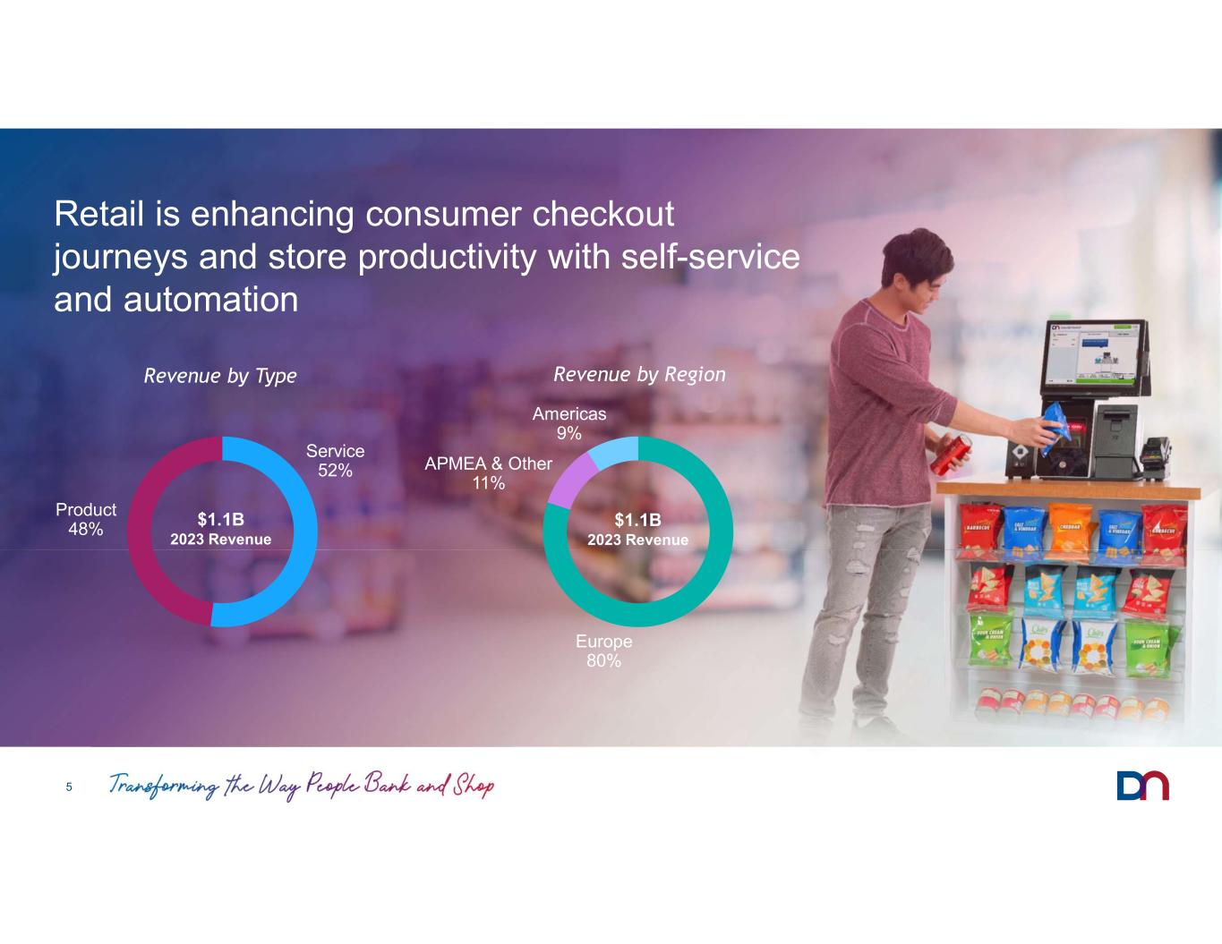 4 Banking strength driven by adoption of DN Series® recyclers supporting branch transformation Revenue by Type Service 60% Product 40% $2.7B 2023 Revenue Revenue by Region North America 37% Latin America 21% Europe 24% APMEA & Other 18% $2.7B 2023 Revenue