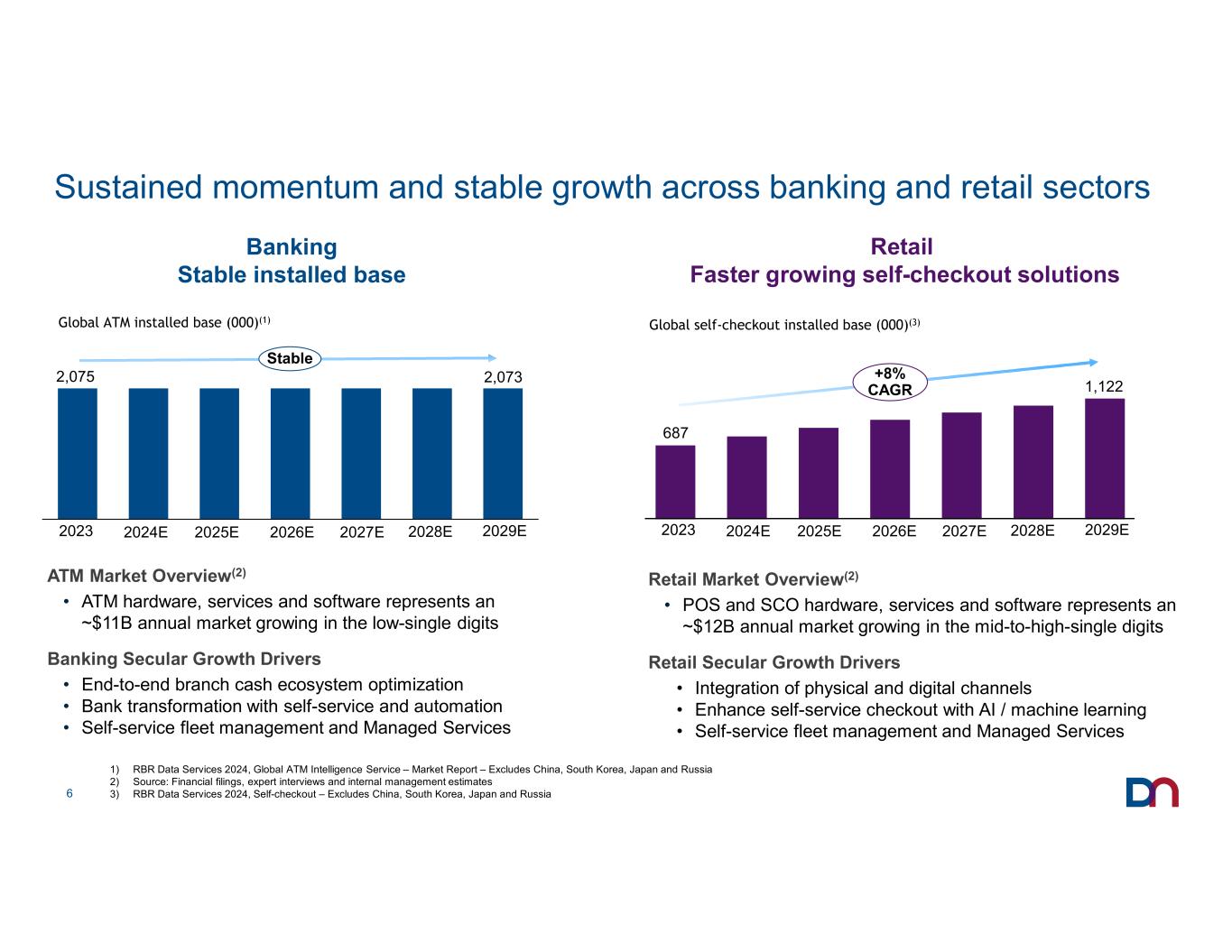 6 Sustained momentum and stable growth across banking and retail sectors Banking Stable installed base Retail Faster growing self-checkout solutions 2023 2024E 2025E 2026E 2027E 2,075 2,073 Stable Global ATM installed base (000)(1) 687 +8% CAGR Global self-checkout installed base (000)(3) ATM Market Overview(2) • ATM hardware, services and software represents an ~$11B annual market growing in the low-single digits Banking Secular Growth Drivers • End-to-end branch cash ecosystem optimization • Bank transformation with self-service and automation • Self-service fleet management and Managed Services Retail Market Overview(2) • POS and SCO hardware, services and software represents an ~$12B annual market growing in the mid-to-high-single digits Retail Secular Growth Drivers • Integration of physical and digital channels • Enhance self-service checkout with AI / machine learning • Self-service fleet management and Managed Services 2028E 2029E 1) RBR Data Services 2024, Global ATM Intelligence Service – Market Report – Excludes China, South Korea, Japan and Russia 2) Source: Financial filings, expert interviews and internal management estimates 3) RBR Data Services 2024, Self-checkout – Excludes China, South Korea, Japan and Russia 2023 2024E 2025E 2026E 2027E 2028E 2029E 1,122