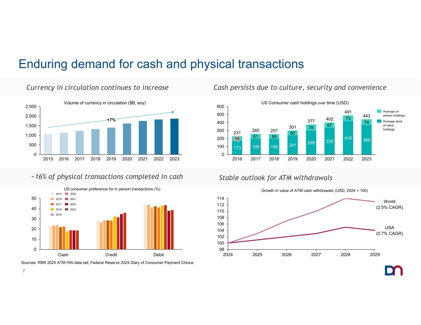 7 Enduring demand for cash and physical transactions 0 10 20 30 40 50 US consumer preference for in person transactions (%) Cash Credit Debit 98 100 102 104 106 108 110 112 114 2024 2025 2026 2027 2028 2029 Growth in value of ATM cash withdrawals (USD, 2024 = 100) USA (0.7% CAGR) World (2.5% CAGR) 2015 2016 2017 2018 2019 2020 2021 2022 2023 Currency in circulation continues to increase ~16% of physical transactions completed in cash Stable outlook for ATM withdrawals 0 500 1,000 1,500 2,000 2,500 Volume of currency in circulation ($B, eoy) 2015 2016 2017 2018 2019 2020 2021 2022 2023 +7% 173 199 198 241 299 335 418 369 61 59 60 78 67 73 74 0 100 200 300 400 500 600 US Consumer cash holdings over time (USD) 58 2016 2017 2018 2019 2020 2021 2022 2023 231 260 257 301 377 402 491 443 Average on person holdings Average store of value holdings Cash persists due to culture, security and convenience Sources: RBR 2024 ATM HW data set; Federal Reserve 2024 Diary of Consumer Payment Choice