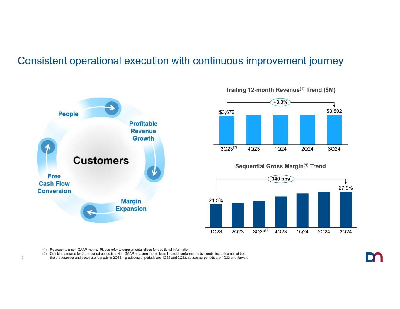 8 Consistent operational execution with continuous improvement journey $3,679 $3,802 3Q23 4Q23 1Q24 2Q24 3Q24 +3.3% 2Q23 3Q23 4Q23 1Q24 2Q24 3Q24 27.9% 24.5% 1Q23 340 bps Trailing 12-month Revenue(1) Trend ($M) Sequential Gross Margin(1) Trend (2) (2) (1) Represents a non-GAAP metric. Please refer to supplemental slides for additional information. (2) Combined results for the reported period is a Non-GAAP measure that reflects financial performance by combining outcomes of both the predecessor and successor periods in 3Q23 – predecessor periods are 1Q23 and 2Q23, successor periods are 4Q23 and forward