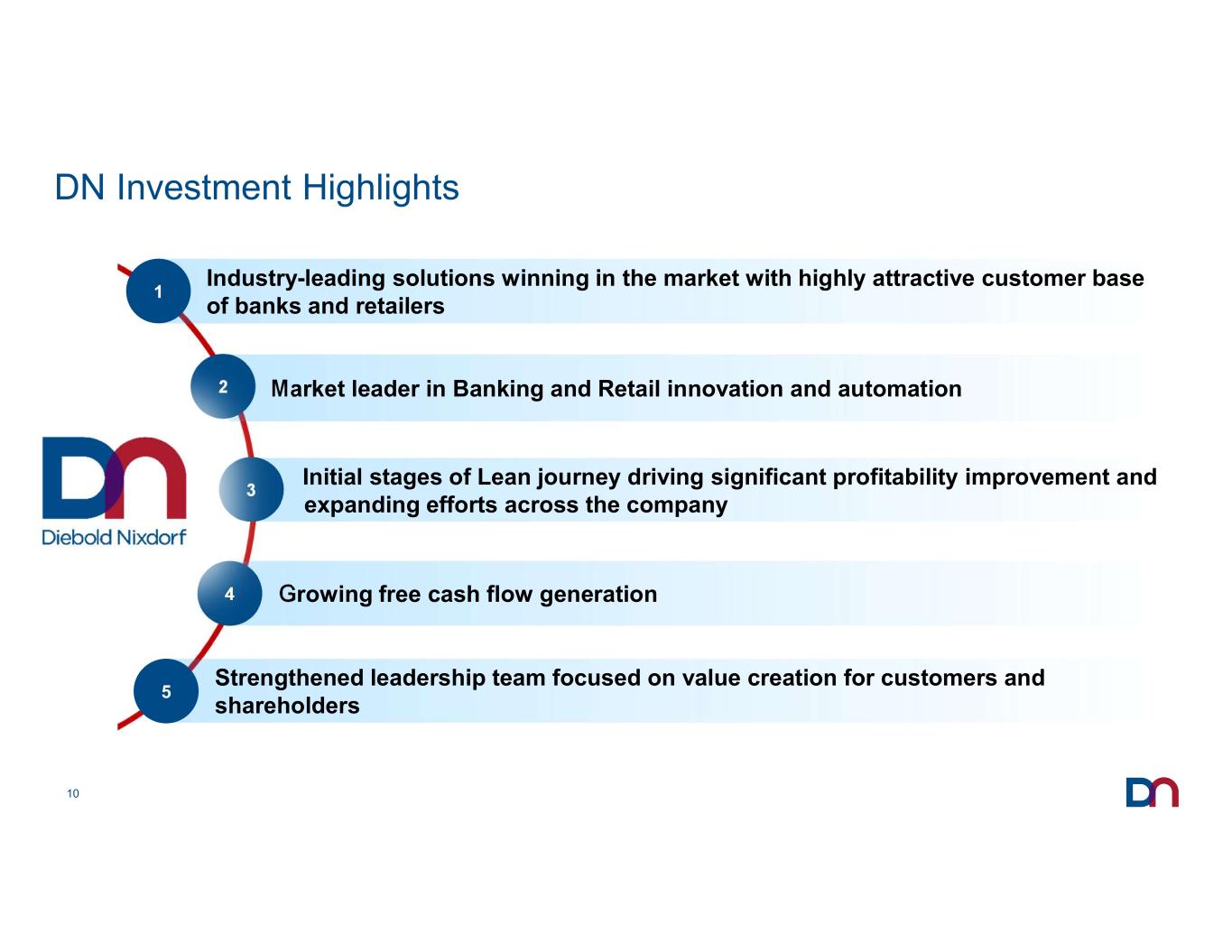 10 DN Investment Highlights Growing free cash flow generation Market leader in Banking and Retail innovation and automation Industry-leading solutions winning in the market with highly attractive customer base of banks and retailers Initial stages of Lean journey driving significant profitability improvement and expanding efforts across the company 4 2 1 3 Strengthened leadership team focused on value creation for customers and shareholders 5