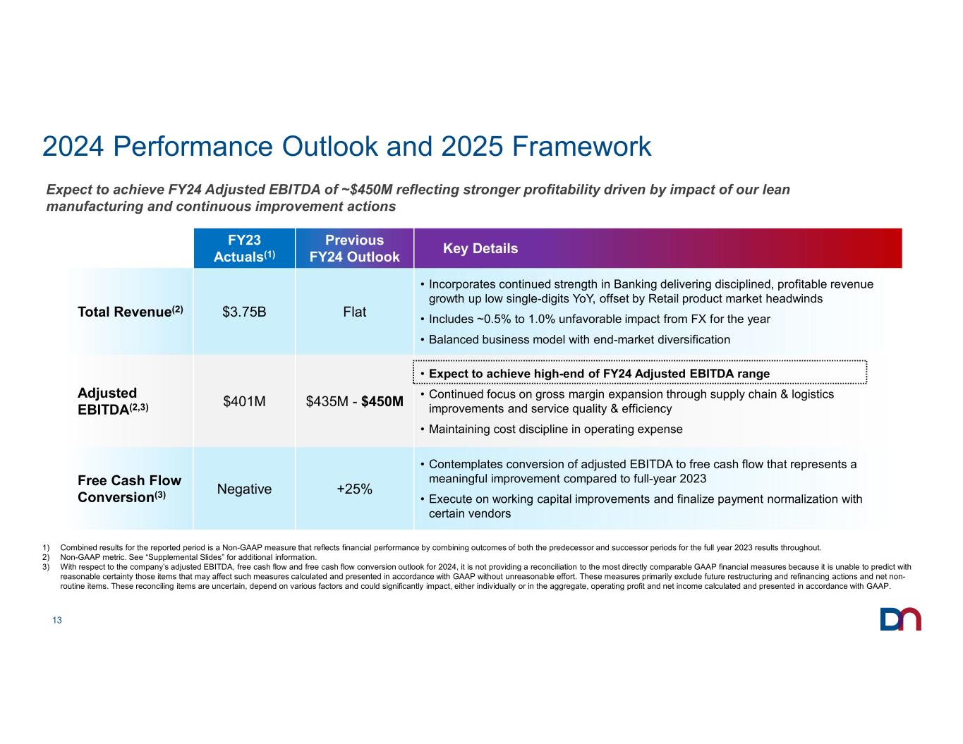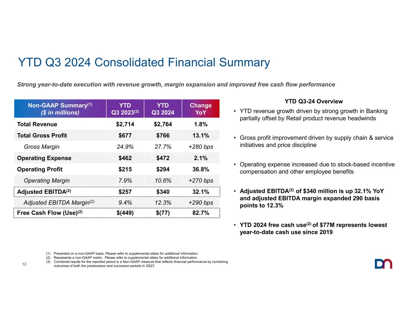12 YTD Q3 2024 Consolidated Financial Summary Strong year-to-date execution with revenue growth, margin expansion and improved free cash flow performance Change YoY YTD Q3 2024 YTD Q3 2023(3) Non-GAAP Summary(1) ($ in millions) 1.8%$2,764$2,714Total Revenue 13.1%$766$677Total Gross Profit +280 bps27.7%24.9%Gross Margin 2.1%$472$462Operating Expense 36.8%$294$215Operating Profit +270 bps10.6%7.9%Operating Margin 32.1%$340$257Adjusted EBITDA(2) +290 bps12.3%9.4%Adjusted EBITDA Margin(2) 82.7%$(77)$(449)Free Cash Flow (Use)(2) YTD Q3-24 Overview • YTD revenue growth driven by strong growth in Banking partially offset by Retail product revenue headwinds • Gross profit improvement driven by supply chain & service initiatives and price discipline • Operating expense increased due to stock-based incentive compensation and other employee benefits • Adjusted EBITDA(2) of $340 million is up 32.1% YoY and adjusted EBITDA margin expanded 290 basis points to 12.3% • YTD 2024 free cash use(2) of $77M represents lowest year-to-date cash use since 2019 (1) Presented on a non-GAAP basis. Please refer to supplemental slides for additional information. (2) Represents a non-GAAP metric. Please refer to supplemental slides for additional information. (3) Combined results for the reported period is a Non-GAAP measure that reflects financial performance by combining outcomes of both the predecessor and successor periods in 3Q23