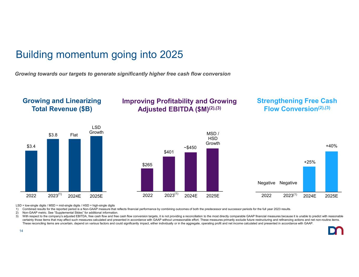 13 2024 Performance Outlook and 2025 Framework Expect to achieve FY24 Adjusted EBITDA of ~$450M reflecting stronger profitability driven by impact of our lean manufacturing and continuous improvement actions Key Details Previous FY24 Outlook FY23 Actuals(1) • Incorporates continued strength in Banking delivering disciplined, profitable revenue growth up low single-digits YoY, offset by Retail product market headwinds • Includes ~0.5% to 1.0% unfavorable impact from FX for the year • Balanced business model with end-market diversification Flat$3.75BTotal Revenue(2) • Expect to achieve high-end of FY24 Adjusted EBITDA range • Continued focus on gross margin expansion through supply chain & logistics improvements and service quality & efficiency • Maintaining cost discipline in operating expense $435M - $450M$401M Adjusted EBITDA(2,3) • Contemplates conversion of adjusted EBITDA to free cash flow that represents a meaningful improvement compared to full-year 2023 • Execute on working capital improvements and finalize payment normalization with certain vendors +25%Negative Free Cash Flow Conversion(3) 1) Combined results for the reported period is a Non-GAAP measure that reflects financial performance by combining outcomes of both the predecessor and successor periods for the full year 2023 results throughout. 2) Non-GAAP metric. See “Supplemental Slides” for additional information. 3) With respect to the company’s adjusted EBITDA, free cash flow and free cash flow conversion outlook for 2024, it is not providing a reconciliation to the most directly comparable GAAP financial measures because it is unable to predict with reasonable certainty those items that may affect such measures calculated and presented in accordance with GAAP without unreasonable effort. These measures primarily exclude future restructuring and refinancing actions and net non- routine items. These reconciling items are uncertain, depend on various factors and could significantly impact, either individually or in the aggregate, operating profit and net income calculated and presented in accordance with GAAP.