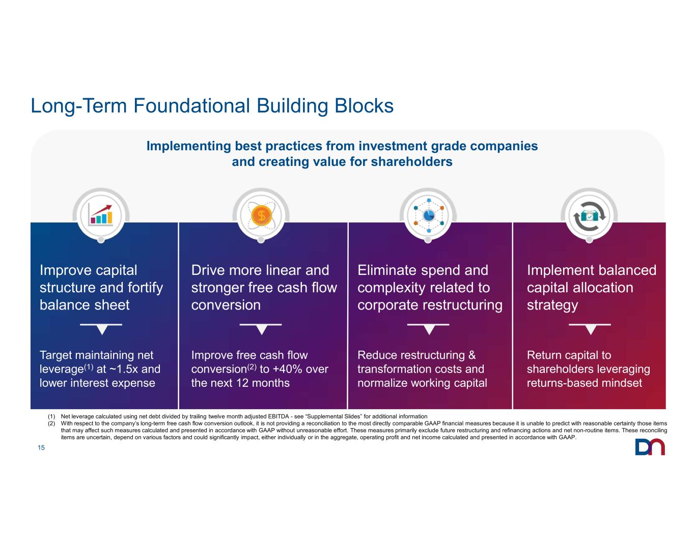 14 Building momentum going into 2025 2023 2024E 2025E2022 $3.4 $3.8 Flat LSD Growth 2023 2024E 2025E2022 $265 $401 ~$450 MSD / HSD Growth 2023 2024E 2025E2022 Negative Negative +25% +40% Growing towards our targets to generate significantly higher free cash flow conversion Growing and Linearizing Total Revenue ($B) Improving Profitability and Growing Adjusted EBITDA ($M)(2),(3) Strengthening Free Cash Flow Conversion(2),(3) LSD = low-single digits / MSD = mid-single digits / HSD = high-single digits 1) Combined results for the reported period is a Non-GAAP measure that reflects financial performance by combining outcomes of both the predecessor and successor periods for the full year 2023 results. 2) Non-GAAP metric. See “Supplemental Slides” for additional information. 3) With respect to the company’s adjusted EBITDA, free cash flow and free cash flow conversion targets, it is not providing a reconciliation to the most directly comparable GAAP financial measures because it is unable to predict with reasonable certainty those items that may affect such measures calculated and presented in accordance with GAAP without unreasonable effort. These measures primarily exclude future restructuring and refinancing actions and net non-routine items. These reconciling items are uncertain, depend on various factors and could significantly impact, either individually or in the aggregate, operating profit and net income calculated and presented in accordance with GAAP. (1) (1) (1)