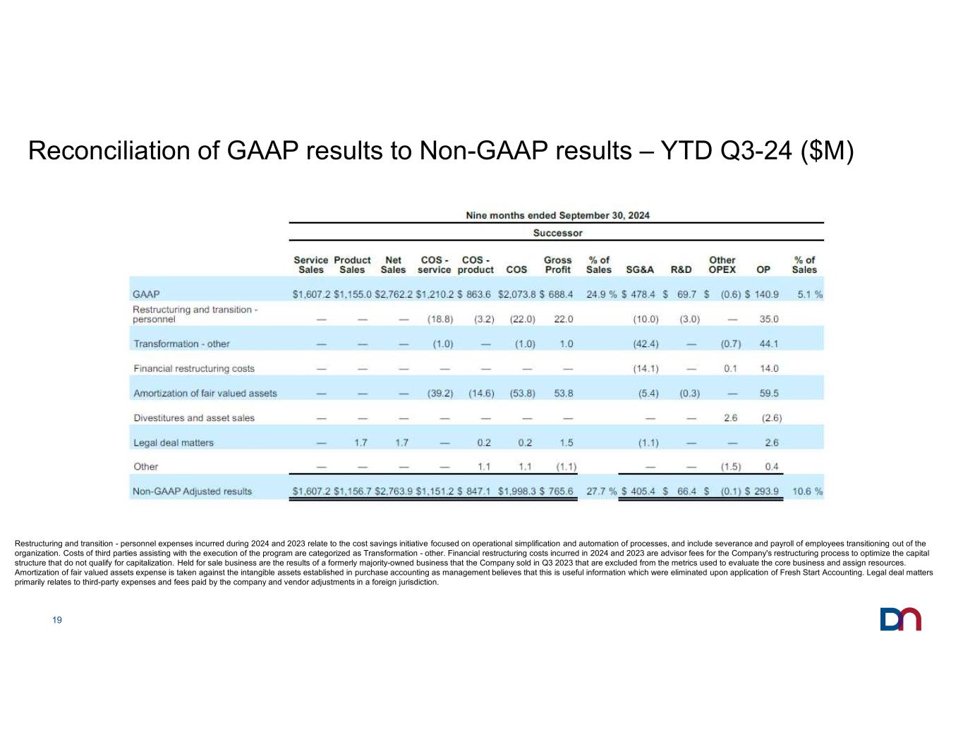 18 Reconciliation of GAAP results to Non-GAAP results – Q3-24 ($M) Restructuring and transition - personnel expenses incurred during 2024 and 2023 relate to the cost savings initiative focused on operational simplification and automation of processes, and include severance and payroll of employees transitioning out of the organization. Costs of third parties assisting with the execution of the program are categorized as Transformation - other. Financial restructuring costs incurred in 2024 and 2023 are advisor fees for the Company's restructuring process to optimize the capital structure that do not qualify for capitalization. Held for sale business are the results of a formerly majority-owned business that the Company sold in Q3 2023 that are excluded from the metrics used to evaluate the core business and assign resources. Amortization of fair valued assets expense is taken against the intangible assets established in purchase accounting as management believes that this is useful information which were eliminated upon application of Fresh Start Accounting. Legal deal matters primarily relates to third-party expenses and fees paid by the company and vendor adjustments in a foreign jurisdiction.