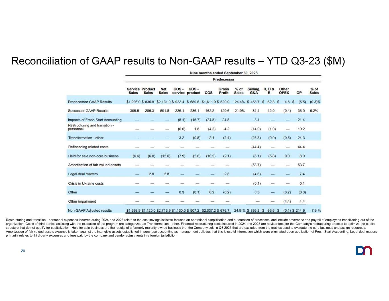 19 Reconciliation of GAAP results to Non-GAAP results – YTD Q3-24 ($M) Restructuring and transition - personnel expenses incurred during 2024 and 2023 relate to the cost savings initiative focused on operational simplification and automation of processes, and include severance and payroll of employees transitioning out of the organization. Costs of third parties assisting with the execution of the program are categorized as Transformation - other. Financial restructuring costs incurred in 2024 and 2023 are advisor fees for the Company's restructuring process to optimize the capital structure that do not qualify for capitalization. Held for sale business are the results of a formerly majority-owned business that the Company sold in Q3 2023 that are excluded from the metrics used to evaluate the core business and assign resources. Amortization of fair valued assets expense is taken against the intangible assets established in purchase accounting as management believes that this is useful information which were eliminated upon application of Fresh Start Accounting. Legal deal matters primarily relates to third-party expenses and fees paid by the company and vendor adjustments in a foreign jurisdiction.