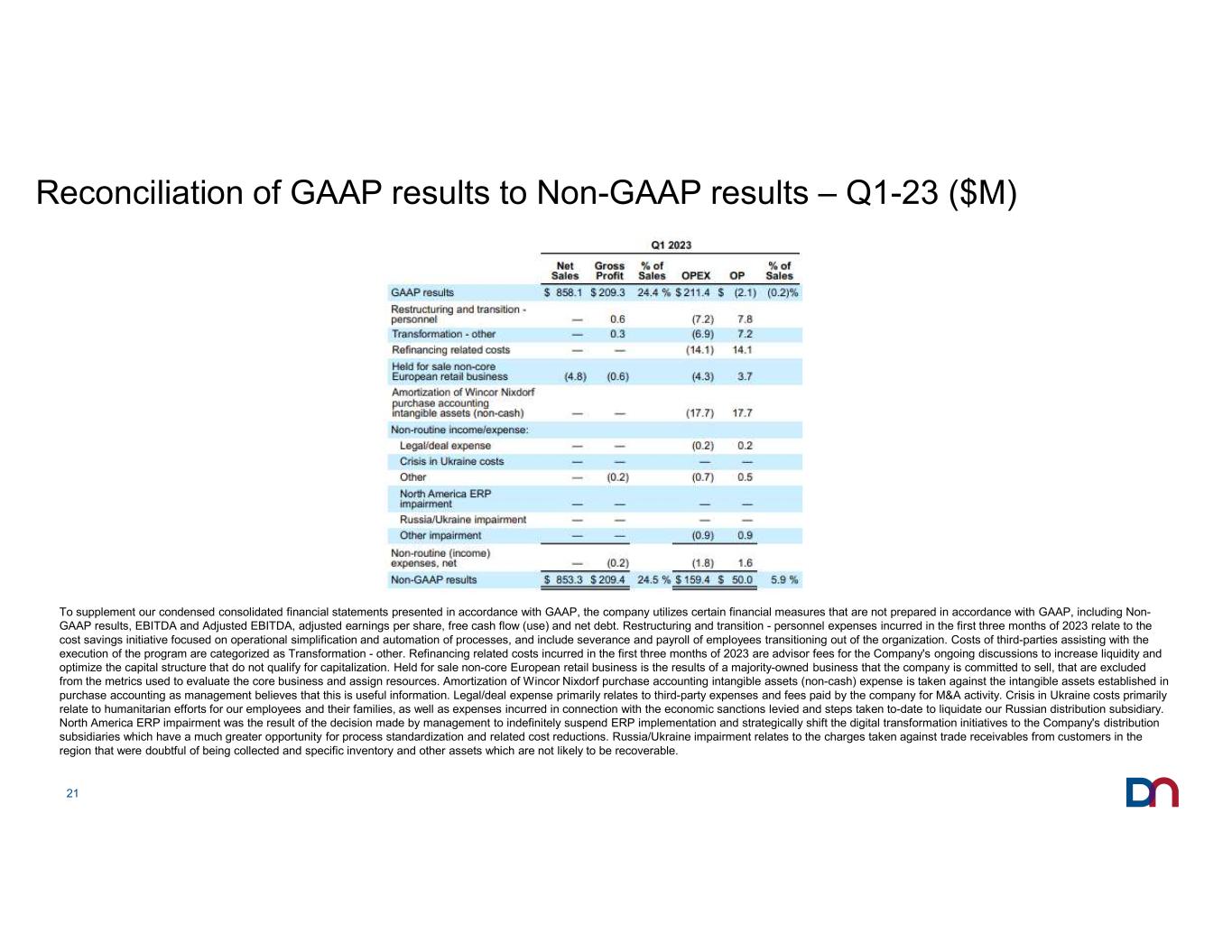 20 Reconciliation of GAAP results to Non-GAAP results – YTD Q3-23 ($M) Restructuring and transition - personnel expenses incurred during 2024 and 2023 relate to the cost savings initiative focused on operational simplification and automation of processes, and include severance and payroll of employees transitioning out of the organization. Costs of third parties assisting with the execution of the program are categorized as Transformation - other. Financial restructuring costs incurred in 2024 and 2023 are advisor fees for the Company's restructuring process to optimize the capital structure that do not qualify for capitalization. Held for sale business are the results of a formerly majority-owned business that the Company sold in Q3 2023 that are excluded from the metrics used to evaluate the core business and assign resources. Amortization of fair valued assets expense is taken against the intangible assets established in purchase accounting as management believes that this is useful information which were eliminated upon application of Fresh Start Accounting. Legal deal matters primarily relates to third-party expenses and fees paid by the company and vendor adjustments in a foreign jurisdiction.