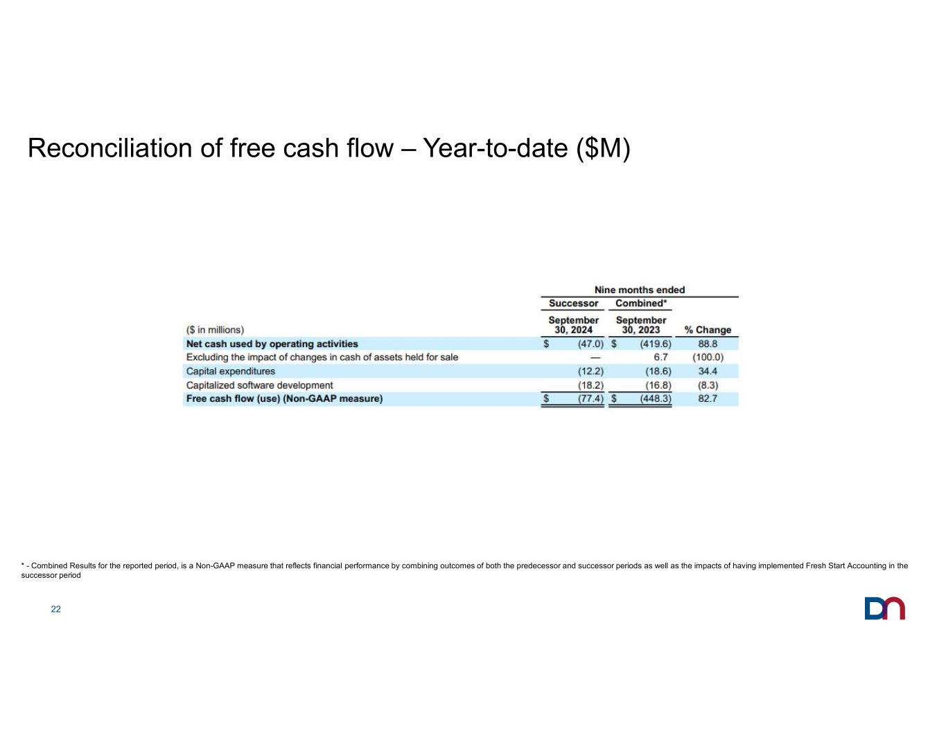 23 Reconciliation of free cash flow – 2023 and 2022 ($M) * - Combined Results for the reported period, is a Non-GAAP measure that reflects financial performance by combining outcomes of both the predecessor and successor periods as well as the impacts of having implemented Fresh Start Accounting in the successor period