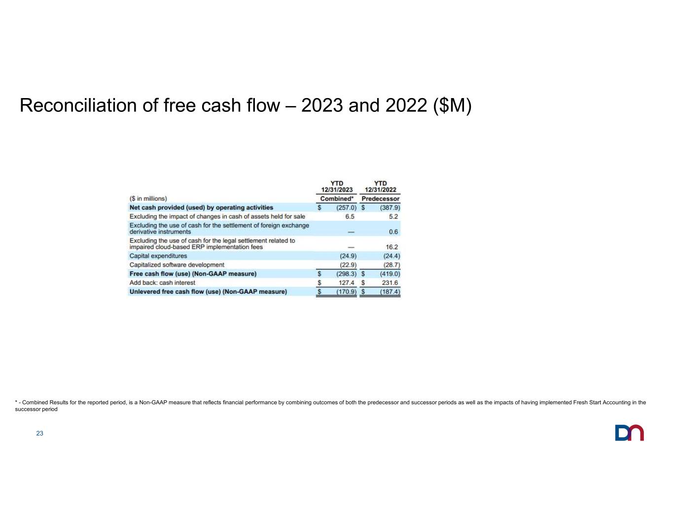 22 Reconciliation of free cash flow – Year-to-date ($M) * - Combined Results for the reported period, is a Non-GAAP measure that reflects financial performance by combining outcomes of both the predecessor and successor periods as well as the impacts of having implemented Fresh Start Accounting in the successor period