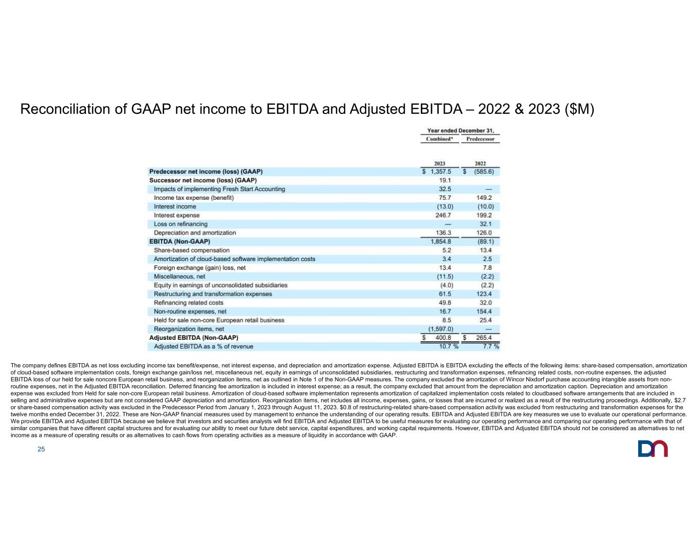 24 Reconciliation of GAAP net income to EBITDA and Adjusted EBITDA – YTD ($M) The company defines EBITDA as net loss excluding income tax benefit/expense, net interest expense, and depreciation and amortization expense. Adjusted EBITDA is EBITDA excluding the effects of the following items: share-based compensation, amortization of cloud-based software implementation costs, foreign exchange gain/loss net, miscellaneous net, equity in earnings of unconsolidated subsidiaries, restructuring and transformation expenses, refinancing related costs, non-routine expenses, the adjusted EBITDA loss of our held for sale noncore business, and reorganization items, net as outlined in Note 1 of the Non-GAAP measures. The company excluded the amortization of Fresh Start fair valued assets and Wincor Nixdorf purchase accounting intangible assets from nonroutine expenses, net in the Adjusted EBITDA reconciliation. Deferred financing fee amortization is included in interest expense; as a result, the company excluded from the depreciation and amortization caption. Depreciation and amortization expense was excluded from Held for sale noncore business. Amortization of cloud-based software implementation represents amortization of capitalized implementation costs related to cloud-based software arrangements that are included in selling and administrative expenses but are not considered GAAP depreciation and amortization. Reorganization items, net includes all income, expenses, gains, or losses that are incurred or realized as a result of the restructuring proceedings. These are Non-GAAP financial measures used by management to enhance the understanding of our operating results. EBITDA and Adjusted EBITDA are key measures we use to evaluate our operational performance. We provide EBITDA and Adjusted EBITDA because we believe that investors and securities analysts will find EBITDA and Adjusted EBITDA to be useful measures for evaluating our operating performance and comparing our operating performance with that of similar companies that have different capital structures and for evaluating our ability to meet our future debt service, capital expenditures, and working capital requirements. However, EBITDA and Adjusted EBITDA should not be considered as alternatives to net income as a measure of operating results or as alternatives to cash flows from operating activities as a measure of liquidity in accordance with GAAP.