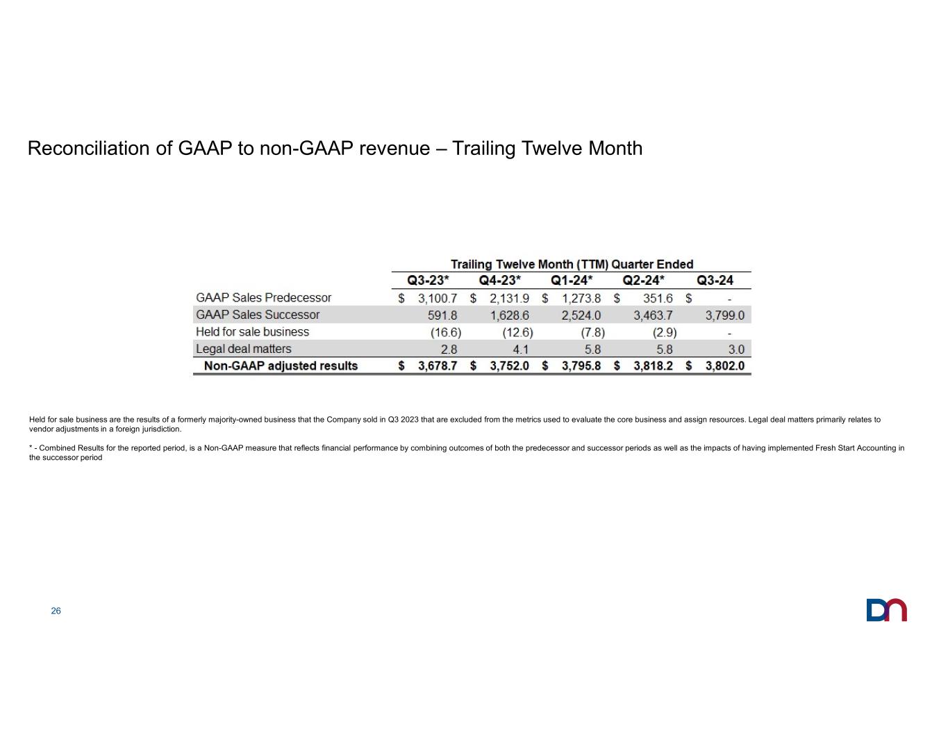 26 Reconciliation of GAAP to non-GAAP revenue – Trailing Twelve Month Held for sale business are the results of a formerly majority-owned business that the Company sold in Q3 2023 that are excluded from the metrics used to evaluate the core business and assign resources. Legal deal matters primarily relates to vendor adjustments in a foreign jurisdiction. * - Combined Results for the reported period, is a Non-GAAP measure that reflects financial performance by combining outcomes of both the predecessor and successor periods as well as the impacts of having implemented Fresh Start Accounting in the successor period